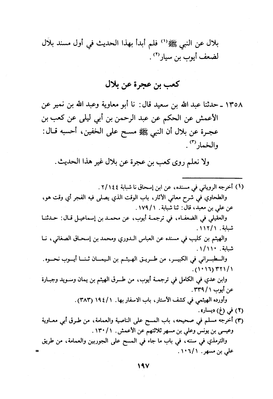 1358 - حَدَّثَنَا عَبْدُ اللَّهِ بْنُ سَعِيدٍ، قَالَ: نا أَبُو مُعَاوِيَةَ، وَعَبْدُ اللَّهِ بْنُ نُمَيْرٍ، عَنِ الْأَعْمَشِ، عَنِ الْحَكَمِ، عَنْ عَبْدِ الرَّحْمَنِ بْنِ أَبِي لَيْلَى، عَنْ كَعْبِ بْنِ عُجْرَةَ، عَنْ بِلَالٍ: «أَنَّ §النَّبِيَّ صَلَّى اللهُ عَلَيْهِ وَسَلَّمَ مَسَحَ عَلَى الْخُفَّيْنِ» ، أَحْسَبُهُ قَالَ: وَالْخِمَارِ وَلَا نَعْلَمُ رَوَى كَعْبُ بْنُ عُجْرَةَ، عَنْ بِلَالٍ غَيْرَ هَذَا الْحَدِيثِ