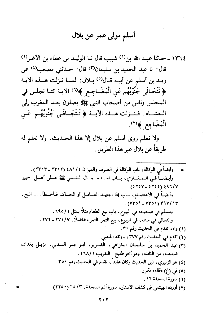 1364 - حَدَّثَنَا عَبْدُ اللَّهِ بْنُ شَبِيبٍ، قَالَ: نا الْوَلِيدُ بْنُ عَطَاءِ بْنِ الْأَغَرِّ، قَالَ: نا عَبْدُ الْحَمِيدِ بْنُ سُلَيْمَانَ، قَالَ: حَدَّثَنِي مُصْعَبٌ، عَنْ زَيْدِ بْنِ أَسْلَمَ، عَنْ أَبِيهِ، قَالَ بِلَالٌ: لَمَّا نَزَلَتْ هَذِهِ الْآيَةُ {تَتَجَافَى جُنُوبُهُمْ عَنِ الْمَضَاجِعِ} [السجدة: 16] الْآيَةُ، §كُنَّا نَجْلِسُ فِي الْمَجْلِسِ، وَناسٌ مِنْ أَصْحَابِ النَّبِيِّ صَلَّى اللهُ عَلَيْهِ وَسَلَّمَ يُصَلُّونَ بَعْدَ الْمَغْرِبِ إِلَى الْعِشَاءِ، فَنَزَلَتْ هَذِهِ الْآيَةُ: {تَتَجَافَى جُنُوبُهُمْ عَنِ الْمَضَاجِعِ} [السجدة: 16] وَلَا نَعْلَمُ رَوَى أَسْلَمُ، عَنْ بِلَالٍ إِلَّا هَذَا الْحَدِيثَ، وَلَا نَعْلَمُ لَهُ طَرِيقًا عَنْ بِلَالٍ غَيْرَ هَذَا الطَّرِيقِ
