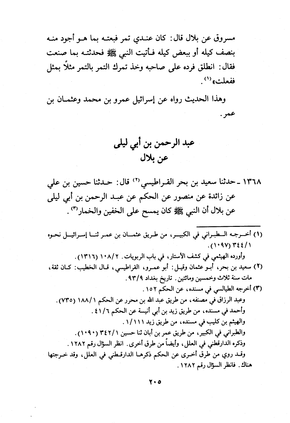 1368 - حَدَّثَنَا سَعِيدُ بْنُ بَحْرٍ الْقَرَاطِيسِيُّ، قَالَ: حَدَّثَنَا حُسَيْنُ بْنُ عَلِيٍّ، عَنْ زَائِدَةَ، عَنْ مَنْصُورٍ، عَنِ الْحَكَمِ، عَنْ عَبْدِ الرَّحْمَنِ بْنِ أَبِي لَيْلَى، عَنْ بِلَالٍ: «أَنَّ §النَّبِيَّ صَلَّى اللهُ عَلَيْهِ وَسَلَّمَ كَانَ يَمْسَحُ عَلَى الْخُفَّيْنِ وَالْخِمَارِ» -[206]- وَلَا نَعْلَمُ رَوَى مَنْصُورٌ، عَنِ الْحَكَمِ، عَنْ عَبْدِ الرَّحْمَنِ بْنِ أَبِي لَيْلَى، عَنْ بِلَالٍ إِلَّا هَذَا الْحَدِيثَ، وَلَا نَعْلَمُ أَحَدًا حَدَّثَ بِهِ، عَنْ مَنْصُورٍ إِلَّا زَائِدَةُ