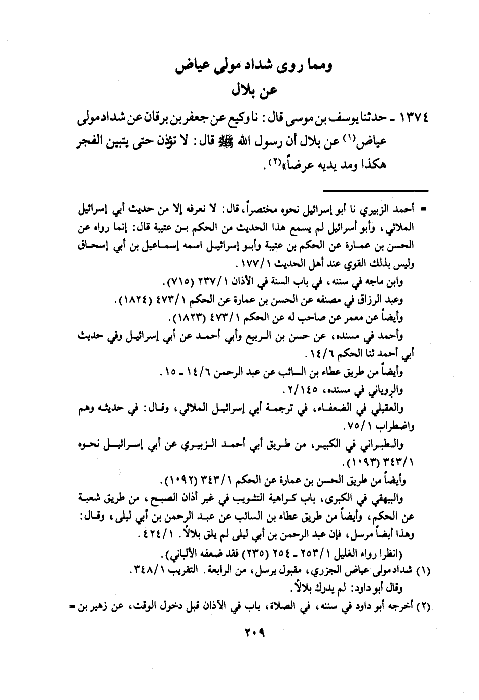 1374 - حَدَّثَنَا يُوسُفُ بْنُ مُوسَى، قَالَ: نا وَكِيعٌ، عَنْ جَعْفَرِ بْنِ بُرْقَانَ، عَنْ شَدَّادٍ، مَوْلَى عِيَاضٍ، عَنْ بِلَالٍ: أَنَّ رَسُولَ اللَّهِ صَلَّى اللهُ عَلَيْهِ وَسَلَّمَ، قَالَ: «§لَا تُؤَذِّنْ حَتَّى يَتَبَيَّنَ الْفَجْرُ هَكَذَا» ، وَمَدَّ يَدَيْهِ عَرْضًا