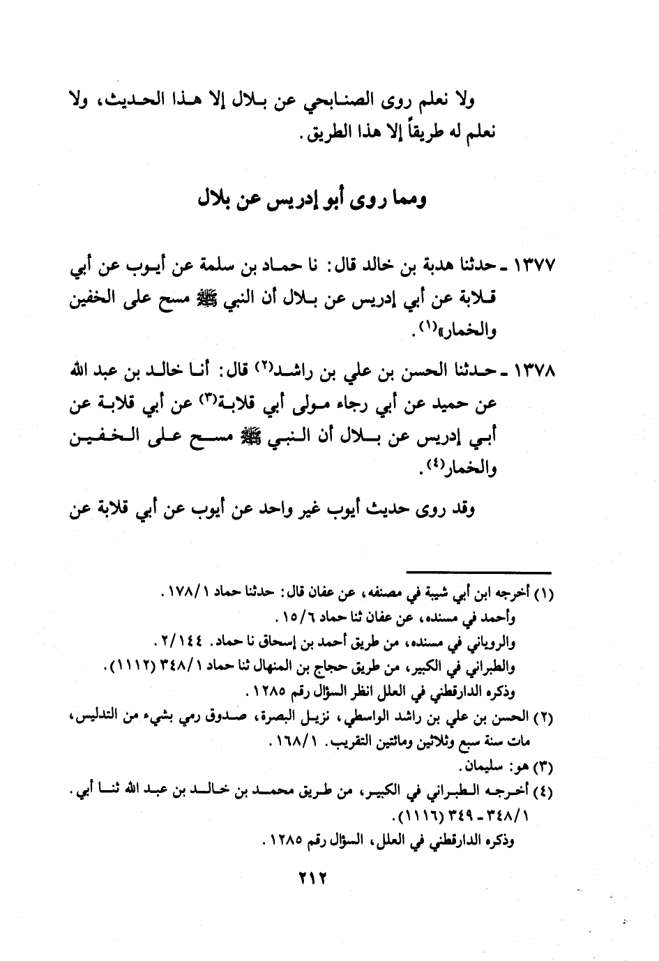 1378 - حَدَّثَنَا الْحَسَنُ بْنُ عَلِيِّ بْنِ رَاشِدٍ، قَالَ: أَنا خَالِدُ بْنُ عَبْدِ اللَّهِ، عَنْ حُمَيْدٍ، عَنْ أَبِي رَجَاءٍ، مَوْلَى أَبِي قِلَابَةَ، عَنْ أَبِي قِلَابَةَ، عَنْ أَبِي إِدْرِيسَ، عَنْ بِلَالٍ: «أَنَّ §النَّبِيَّ صَلَّى اللهُ عَلَيْهِ وَسَلَّمَ مَسَحَ عَلَى الْخُفَّيْنِ وَالْخِمَارِ» وَقَدْ رَوَى حَدِيثَ أَيُّوبَ غَيْرُ وَاحِدٍ، عَنْ أَيُّوبَ، عَنْ أَبِي قِلَابَةَ عَنْ -[213]- بِلَالٍ، وَلَمْ يَذْكُرُوا أَبَا إِدْرِيسَ وَلَا نَعْلَمُ أَحَدًا قَالَ عَنْ أَبِي إِدْرِيسَ إِلَّا حَمَّادُ بْنُ سَلَمَةَ، وَلَا قَالَ عَنْ أَبِي رَجَاءٍ، عَنْ أَبِي قِلَابَةَ، عَنْ أَبِي إِدْرِيسَ إِلَّا خَالِدٌ وَقَدْ رَوَاهُ زُهَيْرُ بْنُ مُعَاوِيَةَ، عَنْ حُمَيْدٍ، عَنْ أَبِي رَجَاءٍ، عَنْ أَبِي إِدْرِيسَ، عَنْ بِلَالٍ، وَلَمْ يَذْكُرُوا أَبَا قِلَابَةَ، وَأَبُو رَجَاءٍ مَوْلَى أَبِي قِلَابَةَ مَشْهُورٌ رَوَى عَنْهُ حُمَيْدٌ وَالْحَجَّاجُ الصَّوَّافُ، وَرَوَى هَذَا الْحَدِيثَ الْمُعْتَمِرُ، عَنْ حُمَيْدٍ، عَنْ أَبِي الْمُتَوَكِّلِ فَأَخْطَأَ فِيهِ