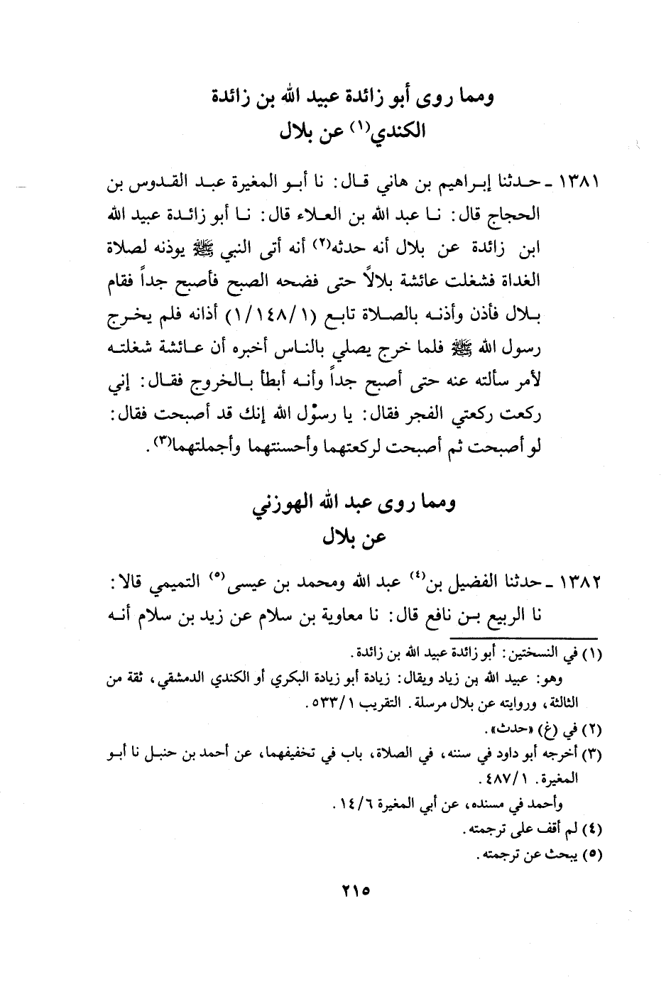 1381 - حَدَّثَنَا إِبْرَاهِيمُ بْنُ هَانِي، قَالَ: نا أَبُو الْمُغِيرَةِ عَبْدُ الْقُدُّوسِ بْنُ الْحَجَّاجِ، قَالَ: نا عَبْدُ اللَّهِ بْنُ الْعَلَاءِ، قَالَ: نا أَبُو زَائِدَةَ عُبَيْدُ اللَّهِ بْنُ زَائِدَةَ، عَنْ بِلَالٍ، أَنَّهُ حَدَّثَهُ أَنَّهِ §أَتَى النَّبِيَّ صَلَّى اللهُ عَلَيْهِ وَسَلَّمَ يُوذِنُهُ لِصَلَاةِ الْغَدَاةِ، فَشَغَلَتْ عَائِشَةُ بِلَالًا حَتَّى فَضَحَهُ الصُّبْحُ، فَأَصْبَحَ جِدًّا، فَقَامَ بِلَالٌ فَأَذَّنَ، وَأَذِنَهُ بِالصَّلَاةِ، تَابَعَ أَذَانَهُ، فَلَمْ يَخْرُجْ رَسُولُ اللَّهِ صَلَّى اللهُ عَلَيْهِ وَسَلَّمَ فَلَمَّا خَرَجَ يُصَلَّى بِالنَّاسِ أَخْبَرَهُ أَنَّ عَائِشَةَ شَغَلَتْهُ لِأَمْرٍ سَأَلَتْهُ عَنْهُ حَتَّى أَصْبَحَ جِدًّا، وَأَنَّهُ أَبْطَأَ بِالْخُرُوجِ، فَقَالَ: «إِنِّي رَكَعْتُ رَكْعَتَيِ الْفَجْرِ» ، فَقَالَ: يَا رَسُولَ اللَّهِ إِنَّكَ قَدْ أَصْبَحْتَ، فَقَالَ: «لَوْ أَصْبَحْتُ ثُمَّ أَصْبَحْتُ لَرَكَعْتُهُمَا وَأَحْسَنْتُهُمَا وَأَجْمَلْتُهُمَا»