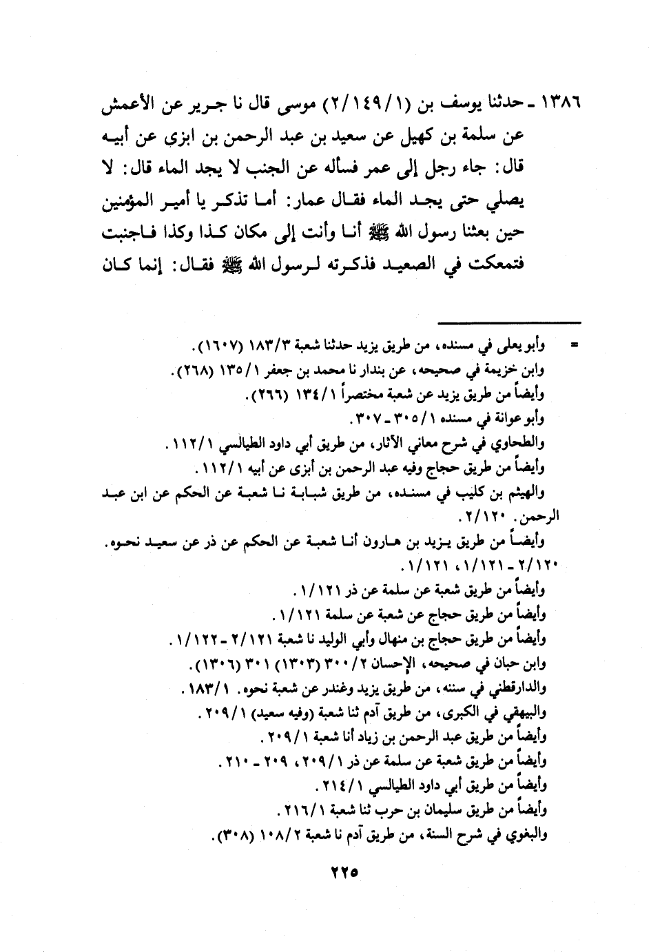 1386 - حَدَّثَنَا يُوسُفُ بْنُ مُوسَى، قَالَ: نا جَرِيرٌ، عَنِ الْأَعْمَشِ، عَنْ سَلَمَةَ بْنِ كُهَيْلٍ، عَنْ سَعِيدِ بْنِ عَبْدِ الرَّحْمَنِ بْنِ أَبْزَى، عَنْ أَبِيهِ قَالَ: جَاءَ رَجُلٌ إِلَى عُمَرَ فَسَأَلَهُ، عَنِ الْجُنُبِ لَا يَجِدُ الْمَاءَ، قَالَ: لَا يُصَلِّ حَتَّى يَجِدَ الْمَاءَ، فَقَالَ عَمَّارٌ: أَمَا تَذْكُرُ يَا أَمِيرَ الْمُؤْمِنِينَ حِينَ بَعَثَنَا رَسُولُ اللَّهِ صَلَّى اللهُ عَلَيْهِ وَسَلَّمَ أَنَا وَأَنْتُ إِلَى مَكَانِ كَذَا وَكَذَا، فَأَجْنَبْتُ فَتَمَعَّكْتُ فِي الصَّعِيدِ، فَذَكَرْتُهُ لِرَسُولِ اللَّهِ صَلَّى اللهُ عَلَيْهِ وَسَلَّمَ فَقَالَ: «§إِنَّمَا كَانَ -[226]- يَكْفِيكَ كَذَا وَكَذَا» ، فَوَضَعَ يَدَيْهِ فِي الصَّعِيدِ فَمَسَحَ بِهِمَا يَدَيْهِ وَوَجْهَهُ وَقَدْ رَوَى هَذَا الْحَدِيثَ غَيْرُ الْأَعْمَشِ، عَنْ سَلَمَةَ بْنِ كُهَيْلٍ، عَنْ أَبِي مَالِكٍ، عَنْ عَمَّارٍ،