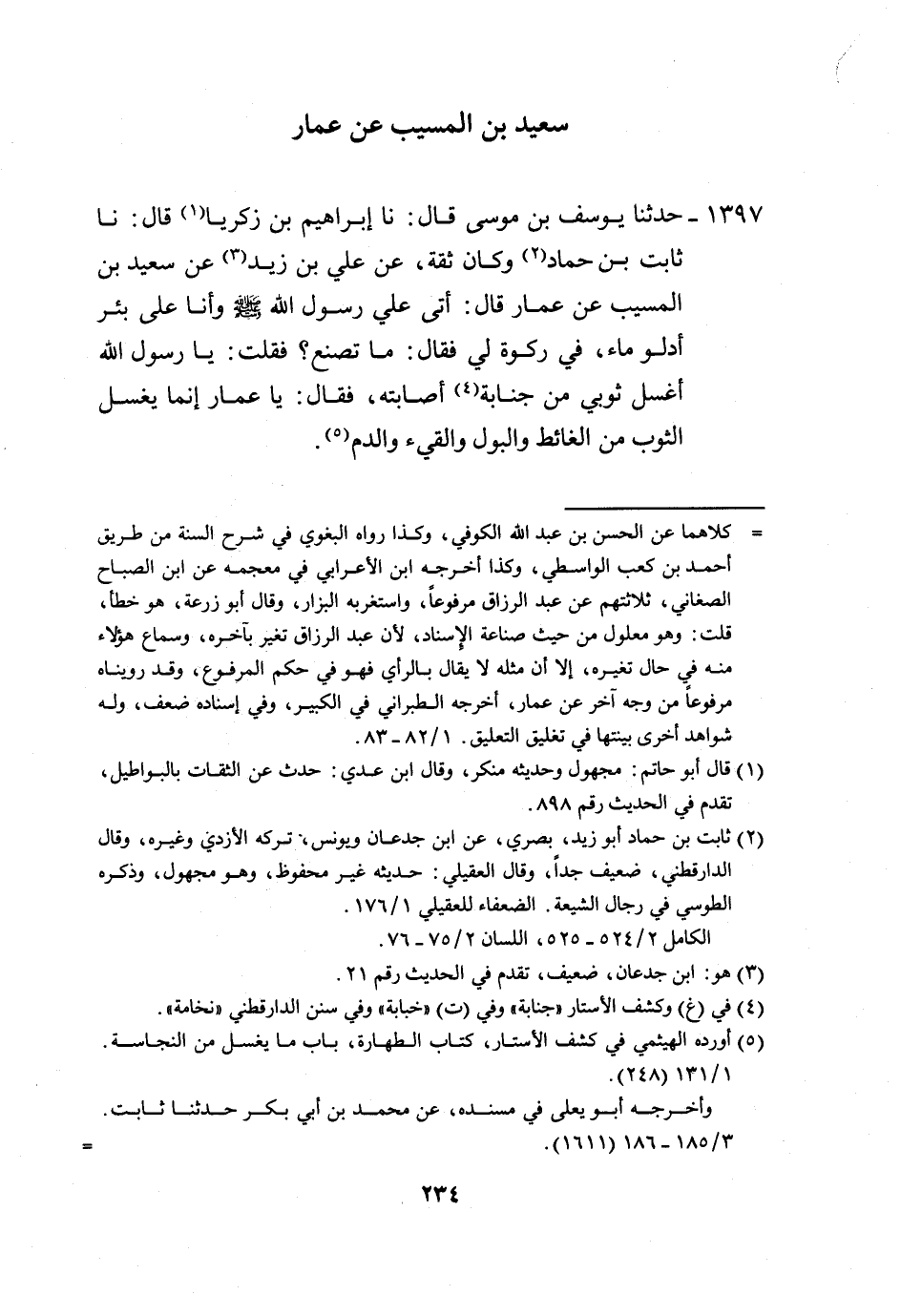 1397 - حَدَّثَنَا يُوسُفُ بْنُ مُوسَى، قَالَ: نا إِبْرَاهِيمُ بْنُ زَكَرِيَّا، قَالَ: نا ثَابِتُ بْنُ حَمَّادٍ وَكَانَ ثِقَةً، عَنْ عَلِيِّ بْنِ زَيْدٍ، عَنْ سَعِيدِ بْنِ الْمُسَيِّبِ، عَنْ عَمَّارٍ، قَالَ: أَتَى عَلَيَّ رَسُولُ اللَّهِ صَلَّى اللهُ عَلَيْهِ وَسَلَّمَ، وَأَنا عَلَى بِئْرٍ أَدْلُو مَاءً فِي رَكْوَةٍ لِي، فَقَالَ: «مَا تَصْنَعُ» فَقُلْتُ يَا رَسُولَ اللَّهِ أَغْسِلُ ثَوْبِي مِنْ جَنابَةٍ أَصَابَتْهُ، فَقَالَ: «يَا عَمَّارُ إِنَّمَا §يُغْسَلُ الثَّوْبُ مِنَ الْغَائِطِ وَالْبَوْلِ، وَالْقَيْءِ، وَالدَّمِ» -[235]- وَهَذَا الْحَدِيثُ لَمْ يَرْوِهِ إِلَّا إِبْرَاهِيمُ بْنُ زَكَرِيَّا، عَنْ ثَابِتِ بْنِ حَمَّادٍ، وَإِبْرَاهِيمُ بْنُ زَكَرِيَّا بَصْرِيُّ قَدْ حَدَّثَ بِغَيْرِ حَدِيثٍ لَمْ يُتَابَعْ عَلَيْهِ، وَأَمَّا ثَابِتُ بْنُ حَمَّادٍ فَلَا نَعْلَمُ رَوَى إِلَّا هَذَا الْحَدِيثَ