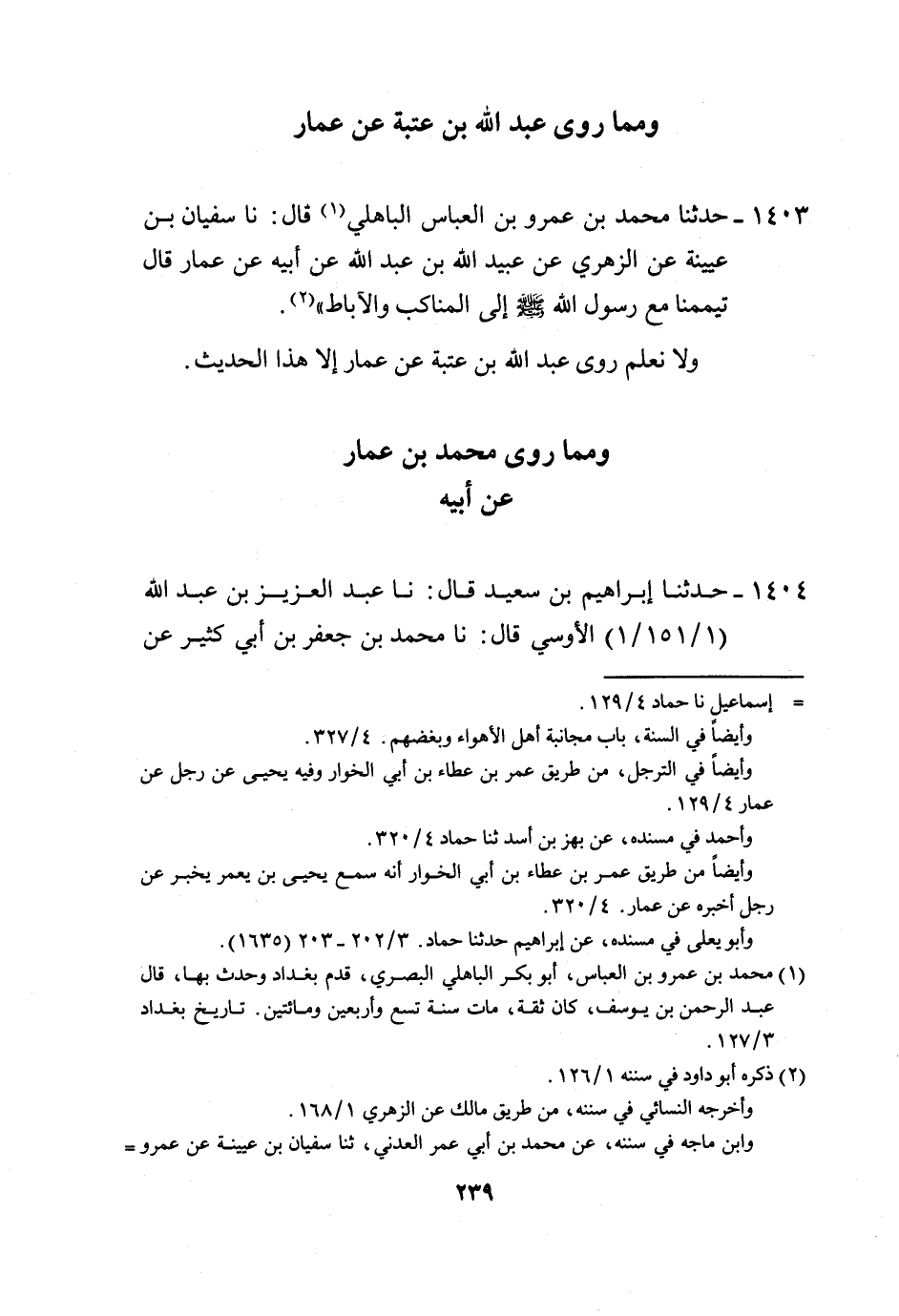 1403 - حَدَّثَنَا مُحَمَّدُ بْنُ عَمْرِو بْنِ الْعَبَّاسِ الْبَاهِلِيُّ، قَالَ: نا سُفْيَانُ بْنُ عُيَيْنَةَ، عَنِ الزُّهْرِيِّ، عَنْ عُبَيْدِ اللَّهِ بْنِ عَبْدِ اللَّهِ، عَنْ أَبِيهِ، عَنْ عَمَّارٍ، قَالَ: «§تَيَمَّمْنَا مَعَ رَسُولِ اللَّهِ صَلَّى اللهُ عَلَيْهِ وَسَلَّمَ إِلَى الْمَنَاكِبِ، وَالْآبَاطِ» وَلَا نَعْلَمُ رَوَى عَبْدُ اللَّهِ بْنُ عُتْبَةَ، عَنْ عَمَّارٍ إِلَّا هَذَا الْحَدِيثَ
