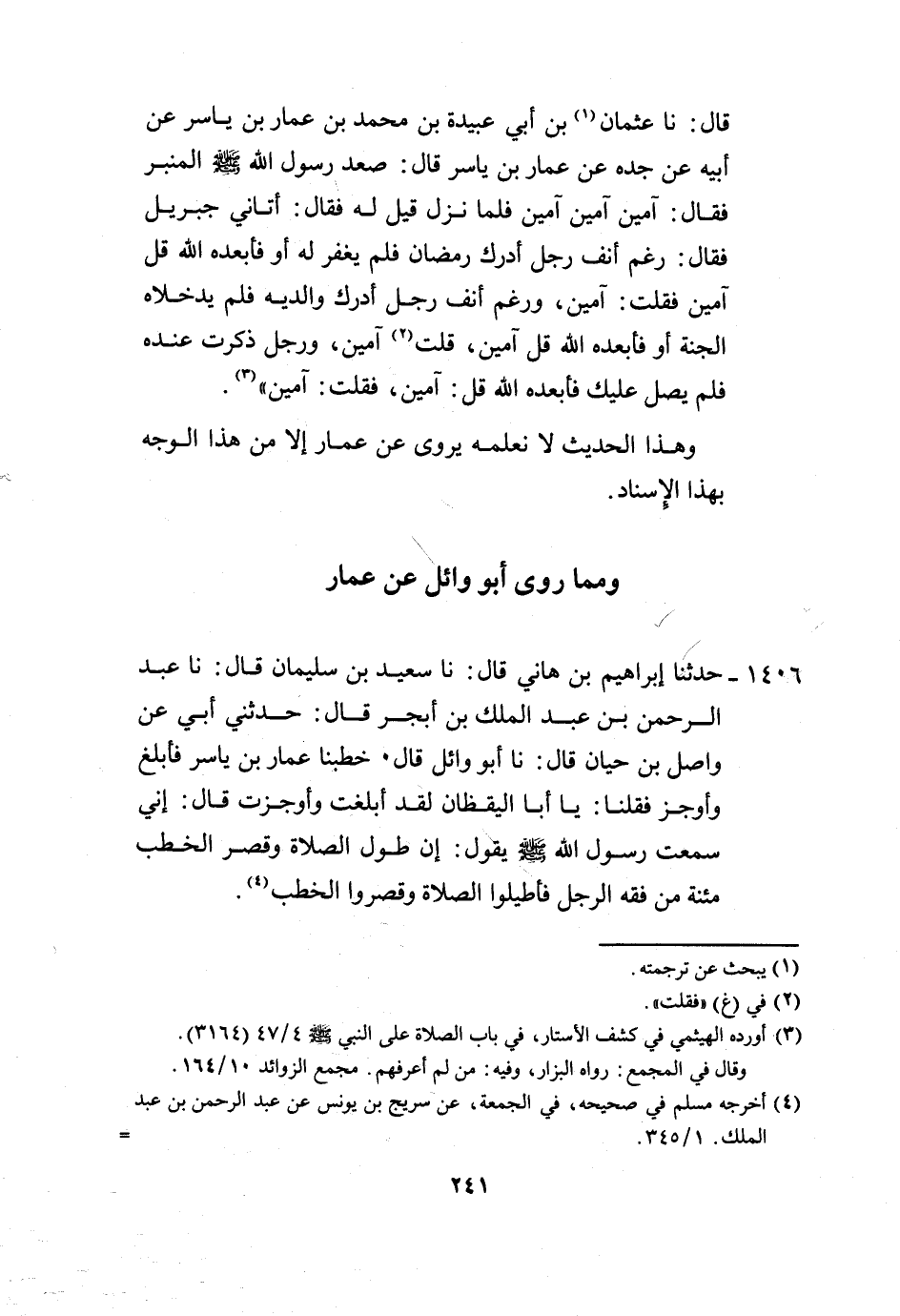 1406 - حَدَّثَنَا إِبْرَاهِيمُ بْنُ هَانِي، قَالَ: نا سَعِيدُ بْنُ سُلَيْمَانَ، قَالَ: نا عَبْدُ الرَّحْمَنِ بْنُ عَبْدِ الْمَلِكِ بْنِ أَبْجَرَ، قَالَ: حَدَّثَنِي أَبِي، عَنْ وَاصِلِ بْنِ حَيَّانَ، قَالَ: نا أَبُو وَائِلٍ، قَالَ: خَطَبَنَا عَمَّارُ بْنُ يَاسِرٍ فَأَبْلَغَ وَأَوْجَزَ، فَقُلْنَا: يَا أَبَا الْيَقْظَانِ: لَقَدْ أَبْلَغْتَ وَأَوْجَزْتَ، قَالَ: إِنِّي سَمِعْتُ رَسُولَ اللَّهِ صَلَّى اللهُ عَلَيْهِ وَسَلَّمَ يَقُولُ: «إِنَّ §طُولَ الصَّلَاةِ، وَقِصَرَ الْخُطَبِ مَئِنَّةٌ مِنْ فِقْهِ الرَّجُلِ، فَأَطِيلُوا الصَّلَاةَ وَقَصِّرُوا الْخُطَبَ» -[242]-،