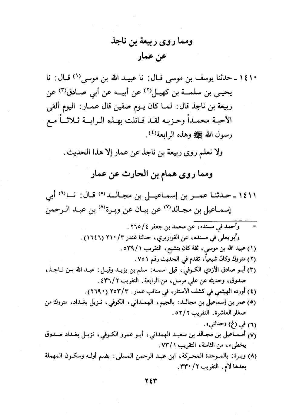 1411 - حَدَّثَنَا عُمَرُ بْنُ إِسْمَاعِيلَ بْنِ مُجَالِدٍ، قَالَ: نا أَبِي إِسْمَاعِيلُ بْنُ مُجَالِدٍ، عَنْ بَيَانٍ، عَنْ وَبَرَةَ بْنِ عَبْدِ الرَّحْمَنِ -[244]- الْمُسْلِيِّ، عَنْ هَمَّامِ بْنِ الْحَارِثِ، قَالَ: قَالَ عَمَّارٌ: «§رَأَيْتُ رَسُولَ اللَّهِ صَلَّى اللهُ عَلَيْهِ وَسَلَّمَ وَمَا مَعَهُ إِلَّا خَمْسَةُ أَعْبُدٍ وَامْرَأَتَانِ وَأَبُو بَكْرٍ» وَهَذَا الْحَدِيثُ لَا نَعْلَمُهُ يُرْوَى عَنْ عَمَّارٍ إِلَّا مِنْ هَذَا الْوَجْهِ بِهَذَا الْإِسْنَادِ