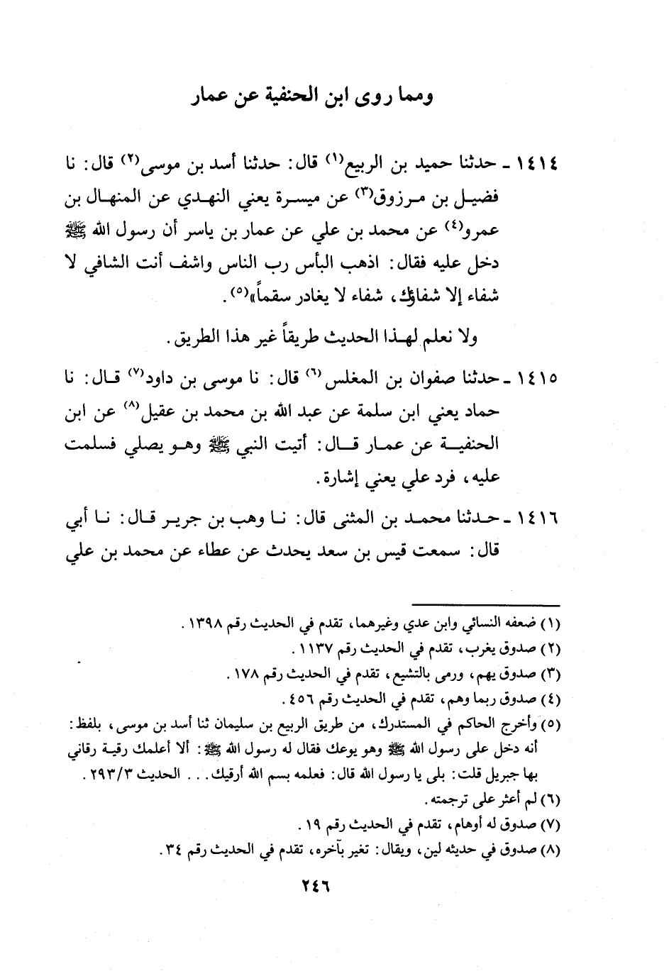 1414 - حَدَّثَنَا حُمَيْدُ بْنُ الرَّبِيعِ، قَالَ: حَدَّثَنَا أَسَدُ بْنُ مُوسَى، قَالَ: نا فُضَيْلُ بْنُ مَرْزُوقٍ، عَنْ مَيْسَرَةَ يَعْنِي النَّهْدِيَّ، عَنِ الْمِنْهَالِ بْنِ عَمْرٍو، عَنْ مُحَمَّدِ بْنِ عَلِيٍّ، عَنْ عَمَّارِ بْنِ يَاسِرٍ: أَنَّ رَسُولَ اللَّهِ صَلَّى اللهُ عَلَيْهِ وَسَلَّمَ دَخَلَ عَلَيْهِ، فَقَالَ: «§أَذْهِبِ الْبَأْسَ رَبَّ النَّاسِ، وَاشْفِ أَنْتَ الشَّافِي لَا شِفَاءَ إِلَّا شِفَاؤُكَ، شِفَاءً لَا يُغَادِرُ سَقَمًا» وَلَا نَعْلَمُ لِهَذَا الْحَدِيثِ طَرِيقًا غَيْرَ هَذَا الطَّرِيقِ