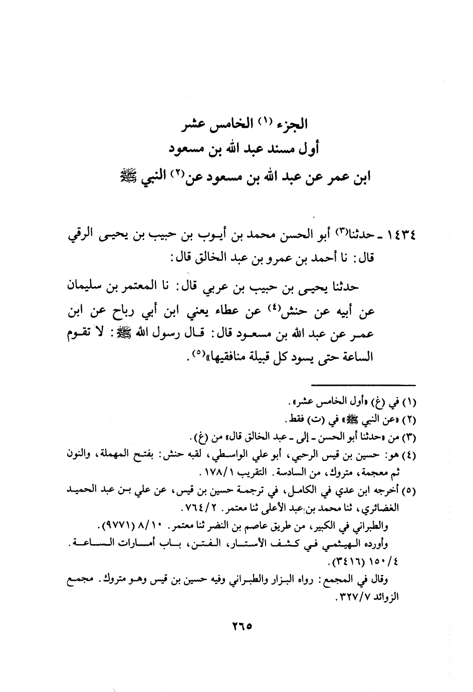 1434 - حَدَّثَنَا أَبُو الْحَسَنِ مُحَمَّدُ بْنُ أَيُّوبَ بْنِ حَبِيبِ بْنِ يَحْيَى الرَّقِّيُّ، قَالَ: نا أَحْمَدُ بْنُ عَمْرِو بْنِ عَبْدِ الْخَالِقِ، قَالَ: حَدَّثَنَا يَحْيَى بْنُ حَبِيبِ بْنِ عَرَبِيٍّ، قَالَ: نَا الْمُعْتَمِرُ بْنُ سُلَيْمَانَ، عَنْ أَبِيهِ، عَنْ حَنَشٍ، عَنْ عَطَاءٍ يَعْنِي ابْنَ أَبِي رَبَاحٍ، عَنِ ابْنِ عُمَرَ، عَنْ عَبْدِ اللَّهِ بْنِ مَسْعُودٍ، قَالَ: قَالَ رَسُولُ اللَّهِ صَلَّى اللهُ عَلَيْهِ وَسَلَّمَ: «§لَا تَقُومُ السَّاعَةُ حَتَّى يَسْوَدَّ كُلُّ قَبِيلَةٍ مُنَافِقِيهَا» -[266]- وَهَذَا الْحَدِيثُ لَا نَعْلَمُ رَوَاهُ عَنِ النَّبِيِّ صَلَّى اللهُ عَلَيْهِ وَسَلَّمَ إِلَّا عَبْدُ اللَّهِ بْنُ مَسْعُودٍ، وَلَا نَعْلَمُ لَهُ طَرِيقًا عَنْ عَبْدِ اللَّهِ إِلَّا هَذَا الطَّرِيقَ، وَحَنَشٌ هَذَا اسْمُهُ حُسَيْنُ بْنُ قَيْسٍ الرَّحَبِيُّ، وَقَدْ رَوَى عَنْهُ غَيْرُ وَاحِدٍ فَقَالَ: حُسَيْنُ بْنُ قَيْسٍ، وَلَا نَعْلَمُ أَحَدًا قَالَ حَنَشٌ إِلَّا التَّيْمِيُّ