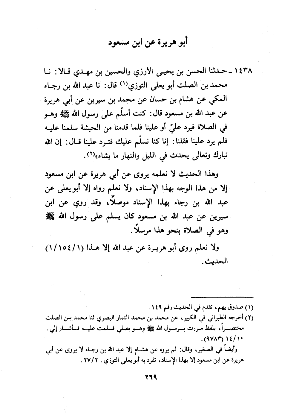 1438 - حَدَّثَنَا الْحَسَنُ بْنُ يَحْيَى الْأَرُزِّيُّ، وَالْحُسَيْنُ بْنُ مَهْدِيٍّ، قَالَا: نا مُحَمَّدُ بْنُ الصَّلْتِ أَبُو يَعْلَى التُّوزِيُّ، قَالَ: نا عَبْدُ اللَّهِ بْنُ رَجَاءٍ الْمَكِّيُّ، عَنْ هِشَامِ بْنِ حَسَّانَ، عَنْ مُحَمَّدِ بْنِ سِيرِينَ، عَنْ أَبِي هُرَيْرَةَ، عَنْ عَبْدِ اللَّهِ بْنِ مَسْعُودٍ، قَالَ: §كُنْتُ أُسَلِّمُ عَلَى رَسُولِ اللَّهِ صَلَّى اللهُ عَلَيْهِ وَسَلَّمَ، وَهُوَ فِي الصَّلَاةِ فَيَرُدُّ عَلَيَّ أَوْ عَلَيْنَا، فَلَمَّا قَدِمْنَا مِنَ الْحَبَشَةِ سَلَّمْنَا عَلَيْهِ فَلَمْ يَرُدَّ عَلَيْنَا، فَقُلْنَا: إِنَّا كُنَّا نُسَلِّمُ عَلَيْكَ فَتُرَدُّ عَلَيْنَا، قَالَ: «إِنَّ اللَّهَ، تَبَارَكَ وَتَعَالَى، يُحْدِثُ فِي اللَّيْلِ وَالنَّهَارِ مَا يَشَاءُ» وَهَذَا الْحَدِيثُ لَا نَعْلَمُهُ يُرْوَى عَنْ أَبِي هُرَيْرَةَ عَنِ ابْنِ مَسْعُودٍ إِلَّا مِنْ هَذَا الْوَجْهِ بِهَذَا الْإِسْنَادِ، وَلَا نَعْلَمُ رَوَاهُ إِلَّا أَبُو يَعْلَى عَنْ عَبْدِ اللَّهِ بْنِ رَجَاءٍ بِهَذَا الْإِسْنَادِ مُوَصَّلًا، وَقَدْ رُوِيَ عَنِ ابْنِ سِيرِينَ، عَنْ عَبْدِ اللَّهِ بْنِ مَسْعُودٍ كَانَ يُسَلِّمُ عَلَى رَسُولِ اللَّهِ صَلَّى اللهُ عَلَيْهِ وَسَلَّمَ وَهُوَ فِي الصَّلَاةِ بِنَحْوِ هَذَا مُرْسَلًا، وَلَا نَعْلَمُ رَوَى أَبُو هُرَيْرَةَ عَنْ عَبْدِ اللَّهِ إِلَّا هَذَا الْحَدِيثَ