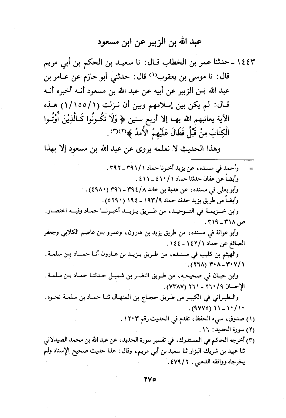 1443 - حَدَّثَنَا عُمَرُ بْنُ الْخَطَّابِ، قَالَ: نا سَعِيدُ بْنُ الْحَكَمِ بْنِ أَبِي مَرْيَمَ، قَالَ: نا مُوسَى بْنُ يَعْقُوبَ، قَالَ: حَدَّثَنِي أَبُو حَازِمٍ، عَنْ عَامِرِ بْنِ عَبْدِ اللَّهِ بْنِ الزُّبَيْرِ، عَنْ أَبِيهِ، عَنْ عَبْدِ اللَّهِ بْنِ مَسْعُودٍ، أَنَّهُ أَخْبَرَهُ أَنَّهُ، قَالَ: " §لَمْ يَكُنْ بَيْنَ إِسْلَامِهِمْ وَبَيْنَ أَنْ نَزَلَتْ هَذِهِ الْآيَةُ يُعَاتِبُهُمُ اللَّهُ بِهَا إِلَّا أَرْبَعُ سِنِينَ: (وَلَا تَكُونُوا كَالَّذِينَ أُوتُوا الْكِتَابَ مِنْ قَبْلُ فَطَالَ عَلَيْهِمُ الْأَمَدُ) " وَهَذَا الْحَدِيثُ لَا نَعْلَمُهُ يُرْوَى عَنْ عَبْدِ اللَّهِ بْنِ مَسْعُودٍ إِلَّا بِهَذَا -[276]- الْإِسْنَادِ، وَلَا نَعْلَمُ رَوَى ابْنُ الزُّبَيْرِ عَنِ ابْنِ مَسْعُودٍ إِلَّا هَذَا الْحَدِيثَ