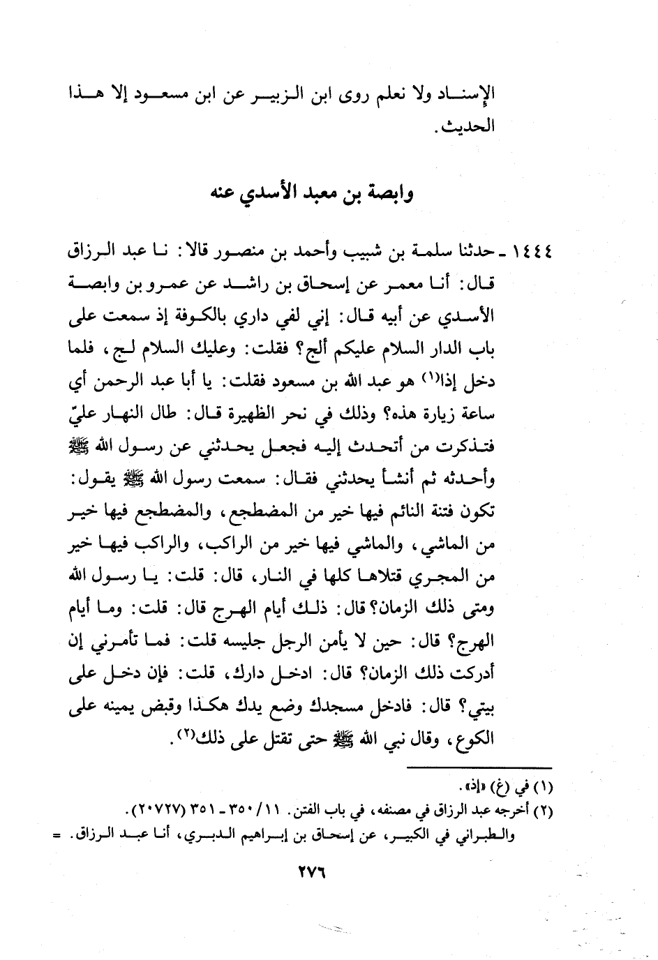 1444 - حَدَّثَنَا سَلَمَةُ بْنُ شَبِيبٍ، وَأَحْمَدُ بْنُ مَنْصُورٍ، قَالَا: نا عَبْدُ الرَّزَّاقِ، قَالَ: أَنَا مَعْمَرٌ، عَنْ إِسْحَاقَ بْنِ رَاشِدٍ، عَنْ عَمْرِو بْنِ وَابِصَةَ الْأَسَدِيُّ، عَنْ أَبِيهِ، قَالَ: إِنِّي لَفِي دَارِي بِالْكُوفَةِ إِذْ سَمِعْتُ عَلَى بَابِ الدَّارِ: السَّلَامُ عَلَيْكُمْ، أَلِجُ؟، فَقُلْتُ: وَعَلَيْكَ السَّلَامُ، لِجْ، فَلَمَّا دَخَلَ إِذَا هُوَ عَبْدُ اللَّهِ بْنُ مَسْعُودٍ، فَقُلْتُ: يَا أَبَا عَبْدِ الرَّحْمَنِ، أَيُّ سَاعَةٍ زِيَارَةٌ هَذِهِ؟، وَذَلِكَ فِي نَحْرِ الظَّهِيرَةِ، قَالَ: طَالَ النَّهَارُ عَلَيَّ فَتَذَكُرَتُ مَنْ أَتَحَدَّثُ إِلَيْهِ، فَجَعَلَ يُحَدِّثُنِي عَنْ رَسُولِ اللَّهِ صَلَّى اللهُ عَلَيْهِ وَسَلَّمَ، وَأُحَدِّثُهُ، ثُمَّ أَنْشَأَ يُحَدِّثُنِي، فَقَالَ: سَمِعْتُ رَسُولَ اللَّهِ صَلَّى اللهُ عَلَيْهِ وَسَلَّمَ يَقُولُ: «§تَكُونُ فِتْنَةٌ النَّائِمُ فِيهَا خَيْرٌ مِنَ الْمُضْطَجِعِ، وَالْمُضْطَجِعُ فِيهَا خَيْرٌ مِنَ الْمَاشِي، وَالْمَاشِي فِيهَا خَيْرٌ مِنَ الرَّاكِبِ، وَالرَّاكِبُ فِيهَا خَيْرٌ مِنَ الْمُجْرِي، قَتْلَاهَا كُلُّهَا فِي النَّارِ» ، قَالَ: قُلْتُ: يَا رَسُولَ اللَّهِ، وَمَتَى ذَلِكَ الزَّمَانُ؟، قَالَ: «ذَلِكَ أَيَّامُ الْهَرْجِ» ، قَالَ: قُلْتُ: وَمَا أَيَّامُ الْهَرْجِ؟، قَالَ: «حِينَ لَا يَأْمَنُ الرَّجُلُ جَلِيسَهُ» ، قُلْتُ: فَمَا تَأْمُرُنِي إِنْ أَدْرَكْتُ ذَلِكَ الزَّمَانَ؟، قَالَ: «ادْخُلْ دَارَكَ» ، قُلْتُ: فَإِنْ دُخِلَ عَلَيَّ بَيْتِي؟، قَالَ: «فَادْخُلْ مَسْجِدَكَ، وَضَعْ يَدَكَ هَكَذَا» ، وَقَبَضَ يَمِينَهُ عَلَى الْكُوعِ، وَقَالَ نَبِيُّ اللَّهِ صَلَّى اللهُ عَلَيْهِ وَسَلَّمَ: «حَتَّى تُقْتَلَ عَلَى ذَلِكَ» -[277]- وَلَا نَعْلَمُ رَوَى وَابِصَةُ بْنُ مَعْبَدٍ عَنِ ابْنِ مَسْعُودٍ إِلَّا هَذَا الْحَدِيثَ بِهَذَا الْإِسْنَادِ
