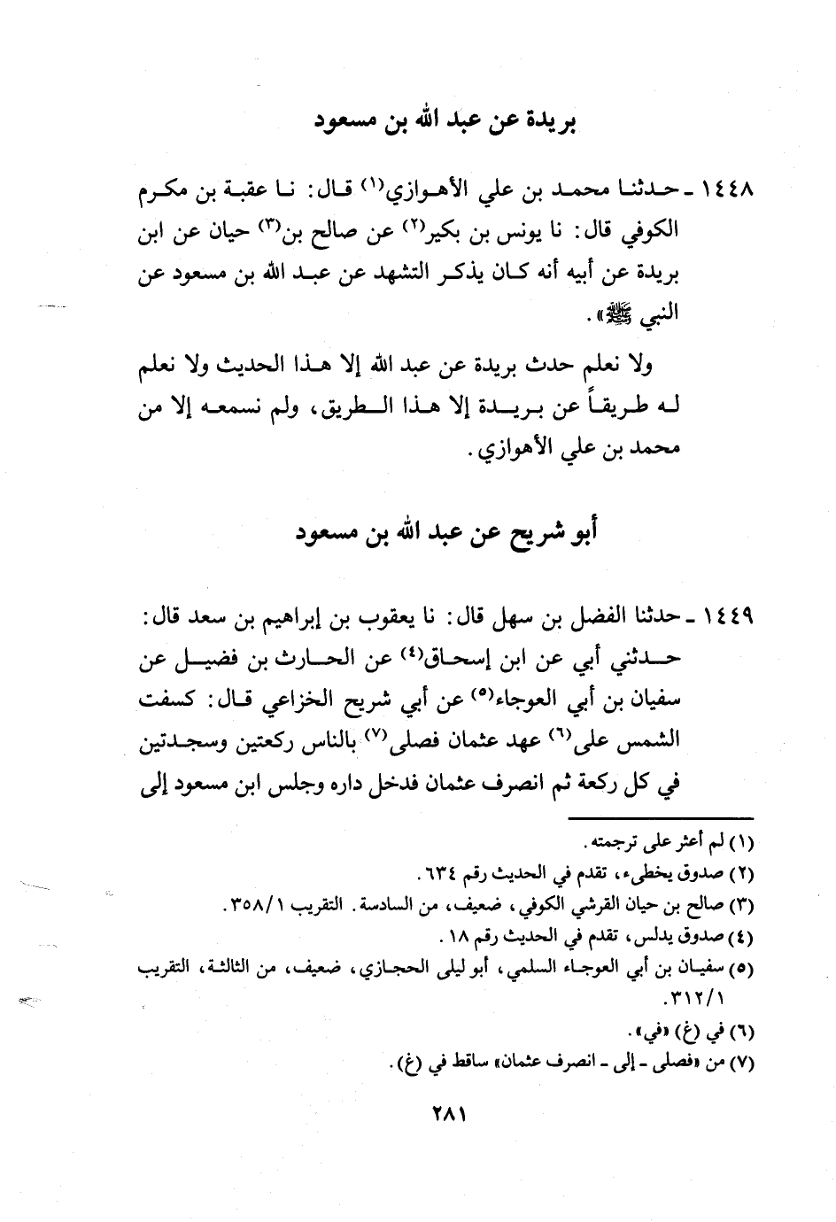 1448 - حَدَّثَنَا مُحَمَّدُ بْنُ عَلِيٍّ الْأَهْوَازِيُّ، قَالَ: نا عُقْبَةُ بْنُ مُكْرَمٍ الْكُوفِيُّ، قَالَ: نا يُونُسُ بْنُ بُكَيْرٍ، عَنْ صَالِحِ بْنِ حَيَّانَ، عَنِ ابْنِ بُرَيْدَةَ، عَنْ أَبِيهِ: أَنَّهُ كَانَ §يَذْكُرُ التَّشَهُّدَ عَنْ عَبْدِ اللَّهِ بْنِ مَسْعُودٍ، عَنِ النَّبِيِّ صَلَّى اللهُ عَلَيْهِ وَسَلَّمَ وَلَا نَعْلَمُ حَدَّثَ بُرَيْدَةُ، عَنْ عَبْدِ اللَّهِ إِلَّا هَذَا الْحَدِيثَ، وَلَا نَعْلَمُ لَهُ طَرِيقًا عَنْ بُرَيْدَةَ إِلَّا هَذَا الطَّرِيقَ، وَلَمْ نَسْمَعْهُ إِلَّا مِنْ مُحَمَّدِ بْنِ عَلِيٍّ الْأَهْوَازِيِّ
