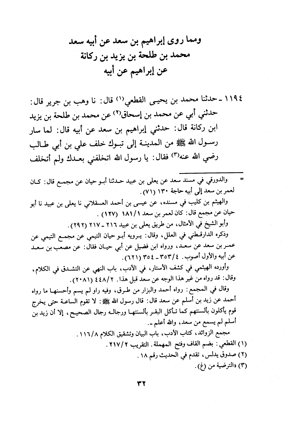 1194 - حَدَّثَنَا مُحَمَّدُ بْنُ يَحْيَى الْقُطَعِيُّ، قَالَ: نَا وَهْبُ بْنُ جَرِيرٍ، قَالَ: حَدَّثَنِي أَبِي، عَنْ مُحَمَّدِ بْنِ إِسْحَاقَ، عَنْ مُحَمَّدِ بْنِ طَلْحَةَ بْنِ يَزِيدَ بْنِ رُكَانَةَ، قَالَ: حَدَّثَنِي إِبْرَاهِيمُ بْنُ سَعْدٍ، عَنْ أَبِيهِ قَالَ: لَمَّا §سَارَ رَسُولُ اللَّهِ صَلَّى اللهُ عَلَيْهِ وَسَلَّمَ مِنَ الْمَدِينَةِ إِلَى تَبُوكَ، خَلَّفَ عَلِيَّ بْنَ أَبِي طَالِبٍ رَضِيَ اللَّهُ عَنْهُ، فَقَالَ: يَا رَسُولَ اللَّهِ، أَتُخَلِّفُنِي بَعْدَكَ، وَلَمْ أَتَخَلَّفْ -[33]- عَنْكَ فِي غَزَاةٍ قَطُّ، قَالَ: «يَا عَلِيُّ ارْجِعْ» ، فَقَالَ: يَا رَسُولَ اللَّهِ إِنَّ الْمُنَافِقِينَ لَيَقُولُونَ إِنَّمَا خَلَّفْتَنِي اسْتِثْقَالًا، فَقَالَ: «يَا عَلِيُّ، أَمَا تَرْضَى أَنْ تَكُونَ مِنِّي بِمَنْزِلَةِ هَارُونَ مِنْ مُوسَى، إِلَّا أَنَّهُ لَا نَبِيَّ بَعْدِي، فَارْجِعْ فَاخْلُفْنِي فِي أَهْلِي وَأَهْلِكَ» وَلَا نَعْلَمُ رَوَى مُحَمَّدُ بْنُ طَلْحَةَ بْنِ يَزِيدَ، عَنْ إِبْرَاهِيمَ، عَنْ أَبِيهِ إِلَّا هَذَا الْحَدِيثَ