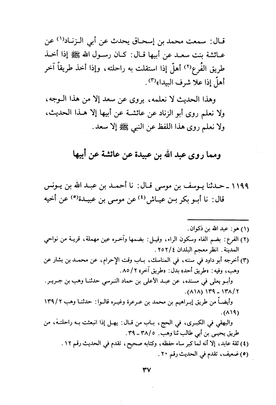 1199 - حَدَّثَنَا يُوسُفُ بْنُ مُوسَى، قَالَ: نَا أَحْمَدُ بْنُ عَبْدِ اللَّهِ بْنِ يُونُسَ، قَالَ: نَا أَبُو بَكْرِ بْنُ عَيَّاشٍ، عَنْ مُوسَى بْنِ عُبَيْدَةَ، عَنْ أَخِيهِ -[38]- عَبْدِ اللَّهِ بْنِ عُبَيْدَةَ، عَنْ عَائِشَةَ ابْنَةِ سَعْدٍ، عَنْ أَبِيهَا، قَالَ: قَالَ رَسُولُ اللَّهِ صَلَّى اللهُ عَلَيْهِ وَسَلَّمَ: «§افْتَرَقَتْ بَنُو إِسْرَائِيلَ عَلَى إِحْدَى وَسَبْعِينَ مِلَّةً، وَلَنْ تَذْهَبَ اللَّيَالِي وَالْأَيَّامُ حَتَّى تَفْتَرِقَ أُمَّتِي عَلَى مِثْلَهَا» وَهَذَا الْحَدِيثُ لَا نَعْلَمُهُ يُرْوَى عَنْ سَعْدٍ إِلَّا مِنْ هَذَا الْوَجْهِ، وَلَا نَعْلَمُ رَوَى عَبْدُ اللَّهِ بْنُ عُبَيْدَةَ، عَنْ عَائِشَةَ، عَنْ أَبِيهَا إِلَّا هَذَا الْحَدِيثَ