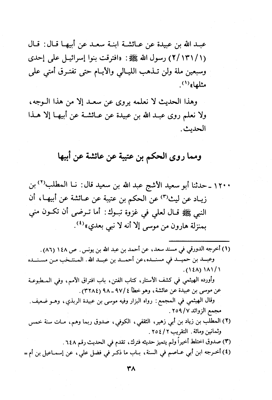 1200 - حَدَّثَنَا أَبُو سَعِيدٍ الْأَشَجُّ عَبْدُ اللَّهِ بْنُ سَعِيدٍ، قَالَ: نَا الْمُطَّلِبُ بْنُ زِيَادٍ، عَنْ لَيْثٍ، عَنِ الْحَكَمِ بْنِ عُتَيْبَةَ، عَنْ عَائِشَةَ، عَنْ أَبِيهَا: أَنَّ النَّبِيَّ صَلَّى اللهُ عَلَيْهِ وَسَلَّمَ، قَالَ لِعَلِيٍّ فِي غَزْوَةِ تَبُوكَ: «§أَمَا تَرْضَى أَنْ تَكُونَ مِنِّي بِمَنْزِلَةِ هَارُونَ مِنْ مُوسَى، إِلَّا أَنَّهُ لَا نَبِيَّ بَعْدِي» -[39]- وَلَا نَعْلَمُ رَوَى هَذَا الْحَدِيثَ عَنْ لَيْثٍ إِلَّا الْمُطَّلِبُ بِهَذَا الْإِسْنَادِ، وَلَا رَوَى الْحَكَمُ، عَنْ عَائِشَةَ، عَنْ أَبِيهَا إِلَّا هَذَا الْحَدِيثَ، وَالصَّوَابُ مَا رَوَاهُ شُعْبَةُ عَنِ الْحَكَمِ، عَنْ مُصْعَبِ بْنِ سَعْدٍ، عَنْ أَبِيهِ،