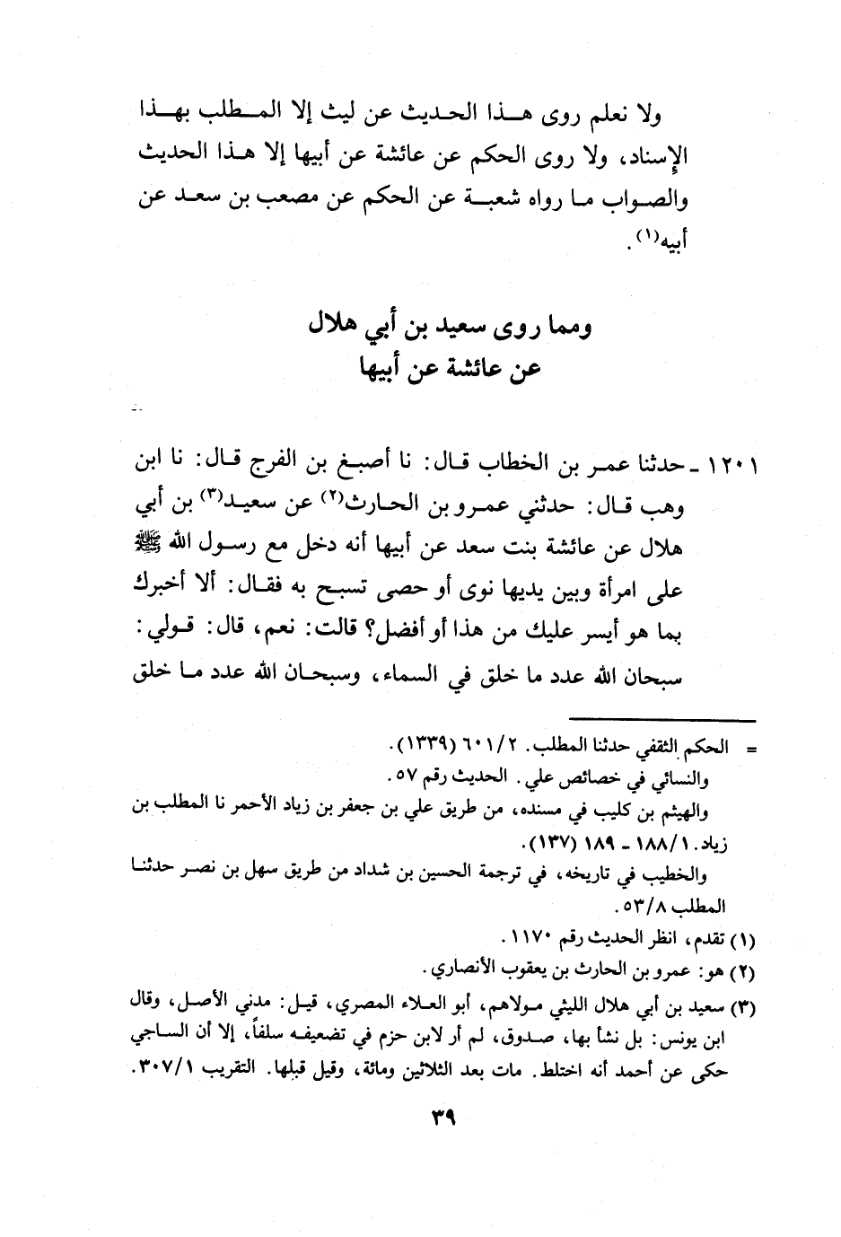 1201 - حَدَّثَنَا عُمَرُ بْنُ الْخَطَّابِ، قَالَ: نَا أَصْبُغُ بْنُ الْفَرَجِ، قَالَ: نَا ابْنُ وَهْبٍ، قَالَ: حَدَّثَنِي عَمْرُو بْنُ الْحَارِثِ، عَنْ سَعِيدِ بْنِ أَبِي هِلَالٍ، عَنْ عَائِشَةَ بِنْتِ سَعْدٍ، عَنْ أَبِيهَا: أَنَّهُ دَخَلَ مَعَ رَسُولِ اللَّهِ صَلَّى اللهُ عَلَيْهِ وَسَلَّمَ عَلَى امْرَأَةٍ، وَبَيْنَ يَدَيْهَا نَوَى أَوْ حَصَى تُسَبِّحُ بِهِ، فَقَالَ: «أَلَا أُخْبِرُكِ بِمَا هُوَ أَيْسَرُ عَلَيْكِ مِنْ هَذَا أَوْ أَفْضَلُ» ، قَالَتْ: نَعَمْ، قَالَ: «§قُولِي سُبْحَانَ اللَّهِ عَدَدَ مَا خَلَقَ فِي السَّمَاءِ، وَسُبْحَانَ اللَّهِ عَدَدَ مَا خَلَقَ -[40]- فِي الْأَرْضِ، وَسُبْحَانَ اللَّهِ عَدَدَ مَا بَيْنَ ذَلِكَ، وَسُبْحَانَ اللَّهِ كَمَا هُوَ أَهْلُهُ، وَاللَّهُ أَكْبَرُ مِثْلُ ذَلِكَ، وَلَا إِلَهَ إِلَّا اللَّهُ مِثْلُ ذَلِكَ، وَالْحَمْدُ لِلَّهِ مِثْلُ ذَلِكَ، وَلَا حَوْلَ، وَلَا قُوَّةَ إِلَّا بِاللَّهِ مِثْلُ ذَلِكَ» -[41]- وَهَذَا الْحَدِيثُ لَا نَعْلَمُهُ يُرْوَى عَنْ سَعْدٍ إِلَّا مِنْ هَذَا الْوَجْهِ بِهَذَا الْإِسْنَادِ