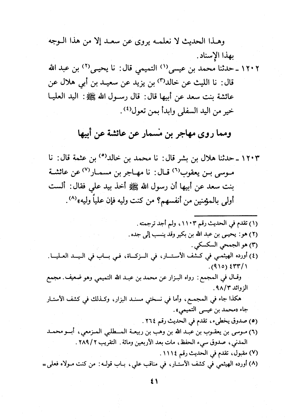 1203 - حَدَّثَنَا هِلَالُ بْنُ بِشْرٍ، قَالَ: نَا مُحَمَّدُ بْنُ خَالِدِ بْنِ عَثْمَةَ، قَالَ: نَا مُوسَى بْنُ يَعْقُوبَ، قَالَ: نَا مُهَاجِرُ بْنُ مِسْمَارٍ، عَنْ عَائِشَةَ بِنْتِ سَعْدٍ، عَنْ أَبِيهَا: أَنَّ رَسُولَ اللَّهِ صَلَّى اللهُ عَلَيْهِ وَسَلَّمَ أَخَذَ بِيَدِ عَلِيٍّ فَقَالَ: «أَلَسْتُ أَوْلَى بِالْمُؤْمِنِينَ مِنْ أَنْفُسِهِمْ؟، §مِنْ كُنْتُ وَلِيَّهُ فَإِنَّ عَلِيًّا وَلِيُّهُ» -[42]- وَهَذَا الْحَدِيثُ لَا نَعْلَمُهُ يُرْوَى مِنْ حَدِيثِ عَائِشَةَ بِنْتِ سَعْدٍ، عَنْ أَبِيهَا إِلَّا مِنْ هَذَا الْوَجْهِ، وَلَا نَعْلَمُ رَوَى الْمُهَاجِرُ بْنُ مِسْمَارٍ، عَنْ عَائِشَةَ، عَنْ أَبِيهَا إِلَّا هَذَا الْحَدِيثَ