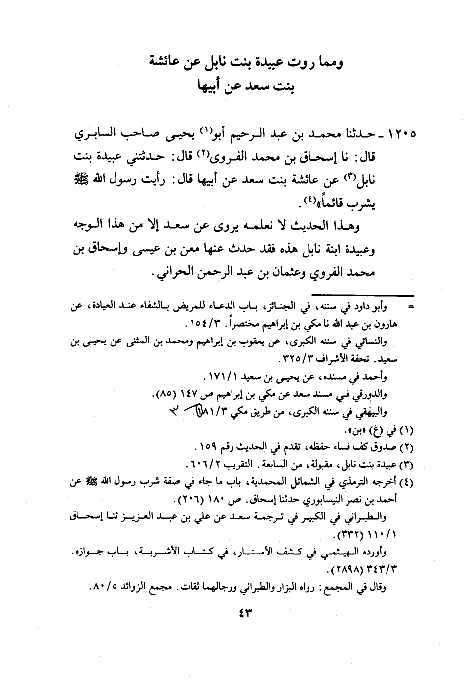 1205 - حَدَّثَنَا مُحَمَّدُ بْنُ عَبْدِ الرَّحِيمِ أَبُو يَحْيَى، صَاحِبُ السَّابِرِيِّ قَالَ: نَا إِسْحَاقُ بْنُ مُحَمَّدٍ الْفَرْوِيُّ، قَالَ: حَدَّثَتْنِي عُبَيْدَةُ بِنْتُ نَابِلٍ، عَنْ عَائِشَةَ بِنْتِ سَعْدٍ، عَنْ أَبِيهَا، قَالَ: «رَأَيْتُ §رَسُولَ اللَّهِ صَلَّى اللهُ عَلَيْهِ وَسَلَّمَ يَشْرَبُ قَائِمًا» وَهَذَا الْحَدِيثُ لَا نَعْلَمُهُ يُرْوَى عَنْ سَعْدٍ إِلَّا مِنْ هَذَا الْوَجْهِ، وَعُبَيْدَةَ ابْنَةَ نَابِلٍ هَذِهِ، فَقَدْ حَدَّثَ عَنْهَا مَعْنُ بْنُ عِيسَى، وَإِسْحَاقُ بْنُ مُحَمَّدٍ الْفَرْوِيُّ وَعُثْمَانُ بْنُ عَبْدِ الرَّحْمَنِ الْحَرَّانِيُّ