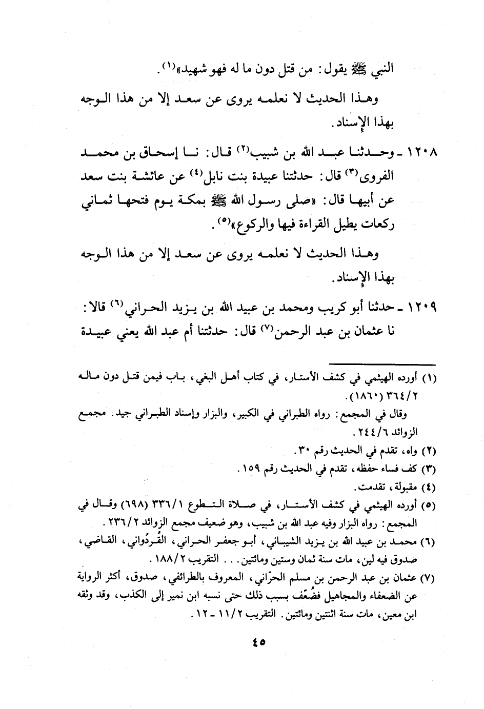 1209 - حَدَّثَنَا أَبُو كُرَيْبٍ، وَمُحَمَّدُ بْنُ عُبَيْدِ اللَّهِ بْنِ يَزِيدَ الْحَرَّانِيُّ، قَالَا: نَا عُثْمَانُ بْنُ عَبْدِ الرَّحْمَنِ، قَالَ: حَدَّثَتْنَا أُمُّ عَبْدِ اللَّهِ يَعْنِي عُبَيْدَةَ -[46]- بِنْتَ نَابِلٍ، عَنْ عَائِشَةَ بِنْتِ سَعْدٍ، عَنْ أَبِيهَا، قَالَ: «§خَرَجْنَا مَعَ النَّبِيِّ صَلَّى اللهُ عَلَيْهِ وَسَلَّمَ فَوَجَدَ تَمْرَتَيْنِ، فَأَخَذَ تَمْرَةً، وَأَعْطَانِي الْأُخْرَى» وَهَذَا الْحَدِيثُ لَا نَعْلَمُهُ يُرْوَى عَنْ سَعْدٍ إِلَّا مِنْ هَذَا الْوَجْهِ