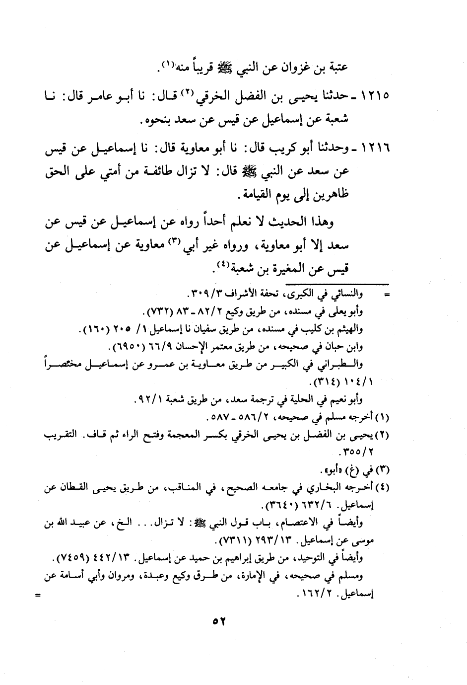 1216 - وَحَدَّثَنَا أَبُو كُرَيْبٍ، قَالَ: نَا أَبُو مُعَاوِيَةَ، قَالَ: نَا إِسْمَاعِيلُ، عَنْ قَيْسٍ، عَنْ سَعْدٍ، عَنِ النَّبِيِّ صَلَّى اللهُ عَلَيْهِ وَسَلَّمَ قَالَ: «§لَا تَزَالُ طَائِفَةٌ مِنْ أُمَّتِي عَلَى الْحَقِّ ظَاهِرِينَ إِلَى يَوْمِ الْقِيَامَةِ» وَهَذَا الْحَدِيثُ لَا نَعْلَمُ أَحَدًا رَوَاهُ عَنْ إِسْمَاعِيلَ، عَنْ قَيْسٍ، عَنْ سَعْدِ إِلَّا أَبُو مُعَاوِيَةَ وَرَوَاهُ غَيْرُ أَبِي مُعَاوِيَةَ، عَنْ إِسْمَاعِيلَ، عَنْ قَيْسٍ، عَنِ الْمُغِيرَةِ بْنِ شُعْبَةَ
