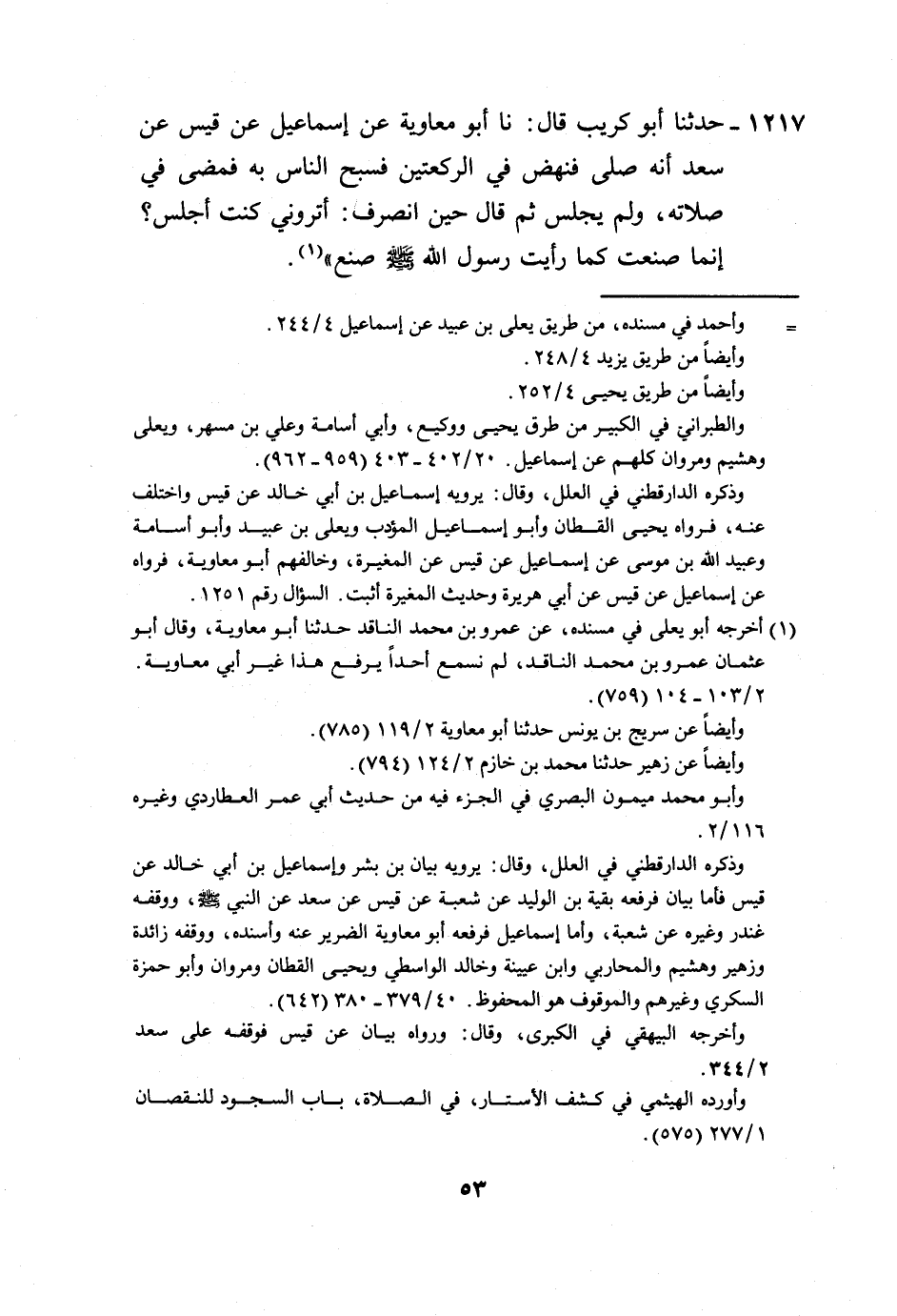 1217 - حَدَّثَنَا أَبُو كُرَيْبٍ، قَالَ: نَا أَبُو مُعَاوِيَةَ، عَنْ إِسْمَاعِيلَ، عَنْ قَيْسٍ، عَنْ سَعْدٍ، أَنَّهُ §صَلَّى فَنَهَضَ فِي الرَّكْعَتَيْنِ، فَسَبَّحَ النَّاسُ بِهِ، فَمَضَى فِي صَلَاتِهِ، وَلَمْ يَجْلِسْ، ثُمَّ قَالَ: حِينَ انْصَرَفَ: «أَتَرَوْنِي كُنْتُ أَجْلِسُ؟، إِنَّمَا صَنَعْتُ كَمَا رَأَيْتُ رَسُولَ اللَّهِ صَلَّى اللهُ عَلَيْهِ وَسَلَّمَ صَنَعَ» -[54]- وَهَذَا الْحَدِيثُ قَدْ رَوَاهُ غَيْرُ وَاحِدٍ، عَنْ إِسْمَاعِيلَ، عَنْ قَيْسٍ، عَنْ سَعْدٍ مَوْقُوفًا وَرَوَاهُ الْمُغِيرَةُ بْنُ شُبَيْلٍ، عَنْ قَيْسٍ، عَنِ الْمُغِيرَةِ بْنِ شُعْبَةَ