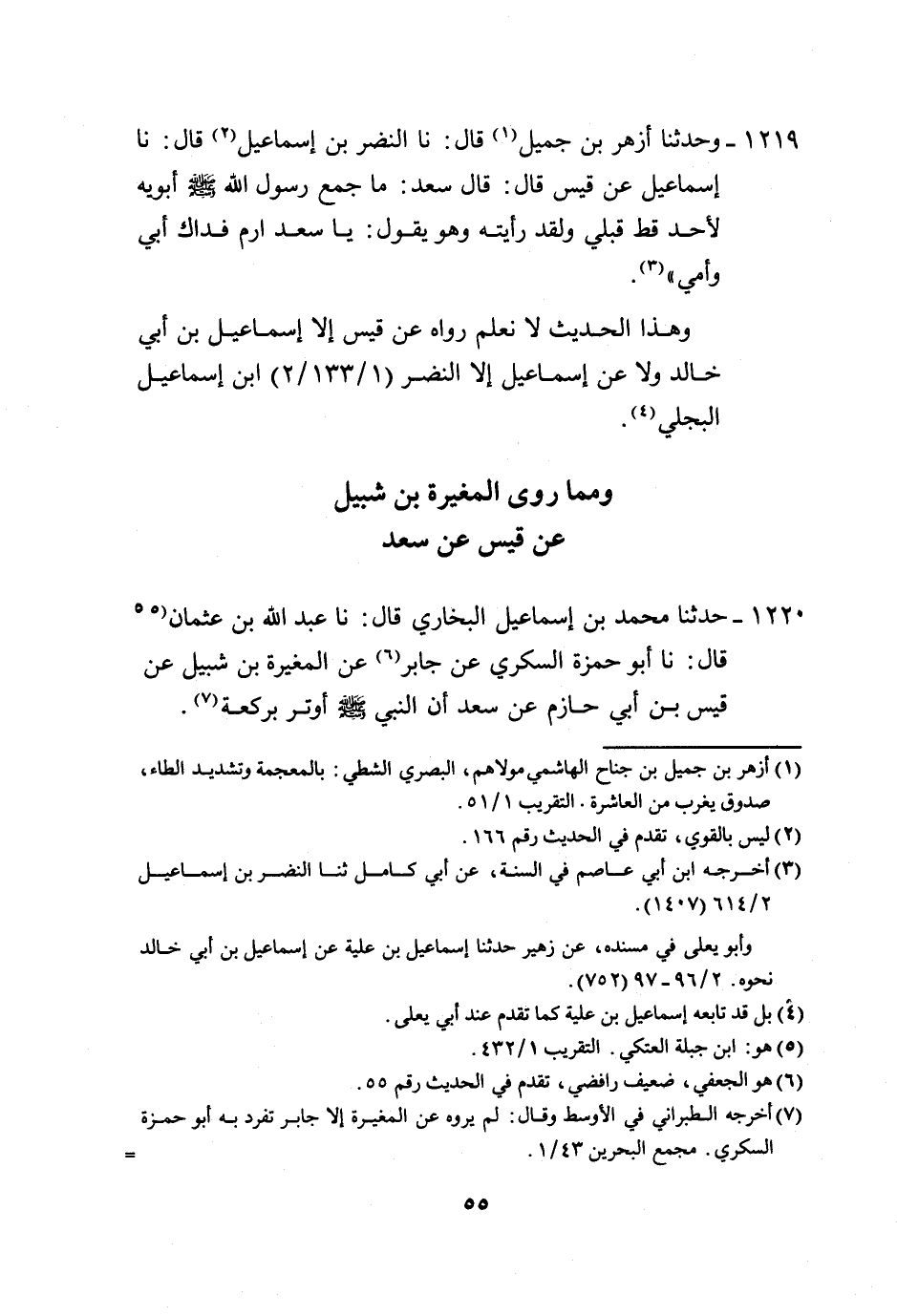 1220 - حَدَّثَنَا مُحَمَّدُ بْنُ إِسْمَاعِيلَ الْبُخَارِيُّ، قَالَ: نَا عَبْدُ اللَّهِ بْنُ عُثْمَانَ، قَالَ: نَا أَبُو حَمْزَةَ السُّكَّرِيُّ، عَنْ جَابِرٍ، عَنِ الْمُغِيرَةِ بْنِ شُبَيْلٍ، عَنْ قَيْسِ بْنِ أَبِي حَازِمٍ، عَنْ سَعْدٍ: «أَنَّ §النَّبِيَّ صَلَّى اللهُ عَلَيْهِ وَسَلَّمَ أَوْتَرَ بِرَكْعَةٍ» -[56]- وَهَذَا الْحَدِيثُ لَا نَعْلَمُ يُرْوَى عَنْ سَعْدِ مَرْفُوعًا إِلَّا مِنْ هَذَا الْوَجْهِ، وَالْمُغِيرَةُ بْنُ شُبَيْلٍ هَذَا رَجُلٌ مَشْهُورٌ مِنْ أَهْلِ الْكُوفَةِ، حَدَّثَ عَنْهُ جَمَاعَةٌ