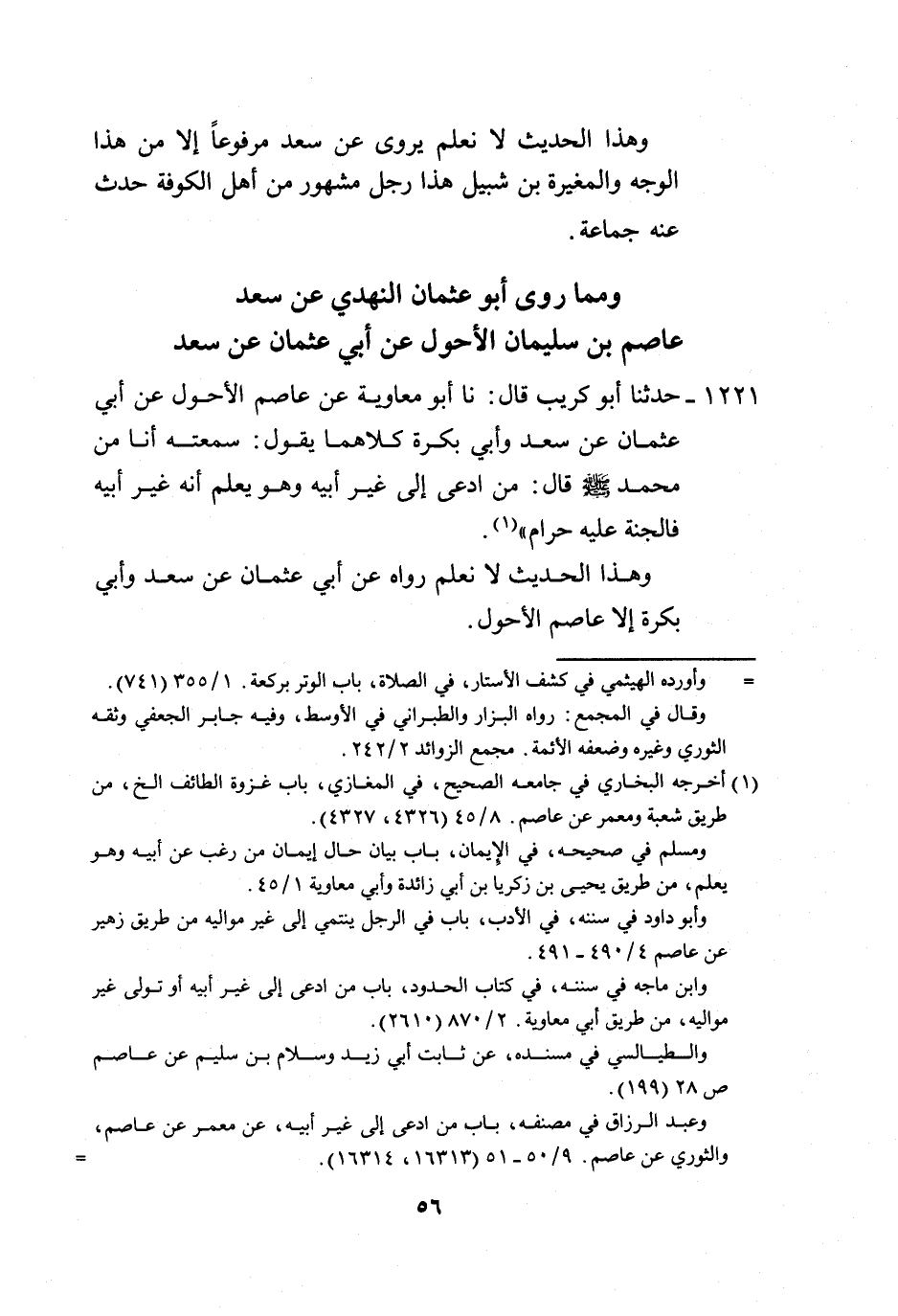 1221 - حَدَّثَنَا أَبُو كُرَيْبٍ، قَالَ: نَا أَبُو مُعَاوِيَةَ، عَنْ عَاصِمٍ الْأَحْوَلَ، عَنْ أَبِي عُثْمَانَ، عَنْ سَعْدٍ، وَأَبِي بَكْرَةَ، كِلَاهُمَا يَقُولُ: سَمِعْتُهُ أَنَا مِنْ مُحَمَّدٍ صَلَّى اللهُ عَلَيْهِ وَسَلَّمَ قَالَ: «§مَنَ ادَّعَى إِلَى غَيْرِ أَبِيهِ، وَهُو يَعْلَمُ أَنَّهُ غَيْرُ أَبِيهِ، فَالْجَنَّةُ عَلَيْهِ حَرَامٌ» وَهَذَا الْحَدِيثُ لَا نَعْلَمُ رَوَاهُ عَنْ أَبِي عُثْمَانَ، عَنْ سَعْدٍ وَأَبِي بَكْرَةَ، إِلَّا عَاصِمٌ الْأَحْوَلُ