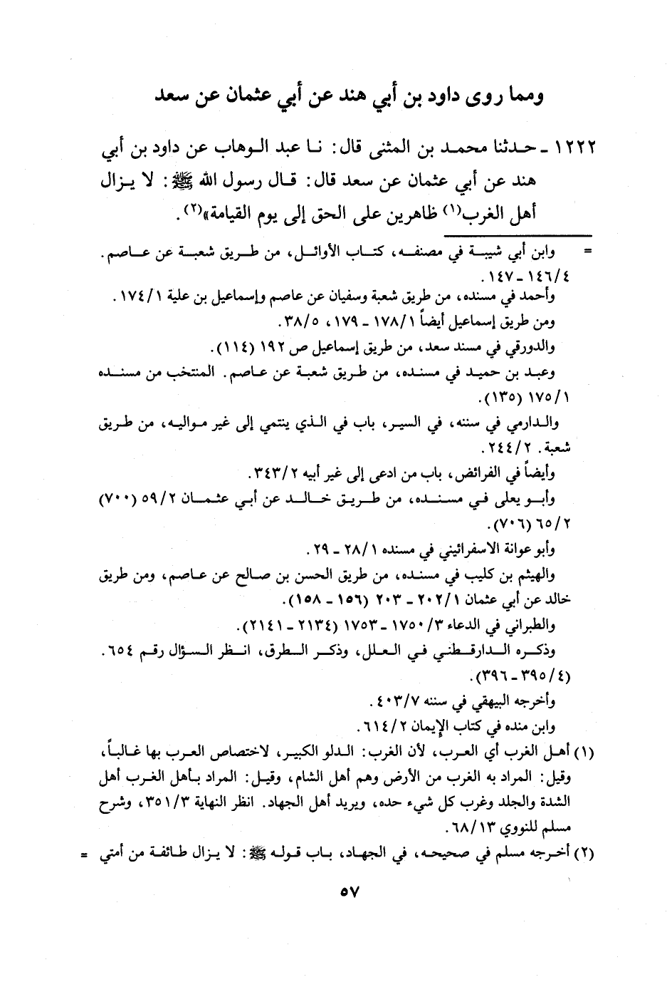 1222 - حَدَّثَنَا مُحَمَّدُ بْنُ الْمُثَنَّى، قَالَ: نَا عَبْدُ الْوَهَّابِ، عَنْ دَاوُدَ بْنِ أَبِي هِنْدَ، عَنْ أَبِي عُثْمَانَ، عَنْ سَعْدٍ، قَالَ: قَالَ رَسُولُ اللَّهِ صَلَّى اللهُ عَلَيْهِ وَسَلَّمَ: «§لَا يَزَالُ أَهْلُ الْغَرْبِ ظَاهِرِينَ عَلَى الْحَقِّ إِلَى يَوْمِ الْقِيَامَةِ» -[58]- وَهَذَا الْحَدِيثُ لَا نَعْلَمُهُ يُرْوَى عَنْ سَعْدٍ إِلَّا بِهَذَا الْإِسْنَادِ