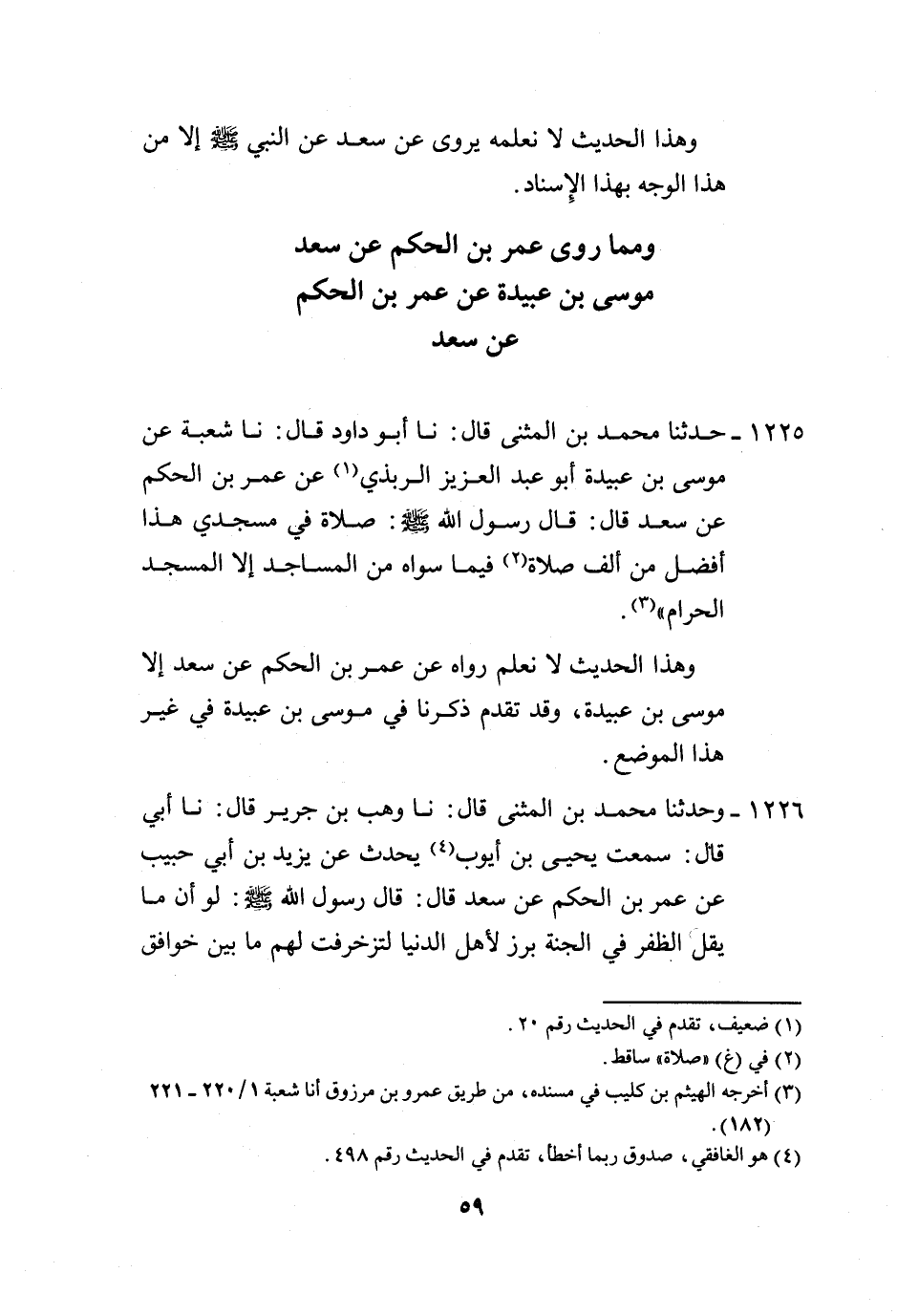 1225 - حَدَّثَنَا مُحَمَّدُ بْنُ الْمُثَنَّى، قَالَ: نَا أَبُو دَاوُدَ، قَالَ: نَا شُعْبَةُ، عَنْ مُوسَى بْنِ عُبَيْدَةَ أَبِي عَبْدِ الْعَزِيزِ الرَّبَذِيُّ، عَنْ عُمَرَ بْنِ الْحَكَمِ، عَنْ سَعْدٍ، قَالَ: قَالَ رَسُولُ اللَّهِ صَلَّى اللهُ عَلَيْهِ وَسَلَّمَ: «§صَلَاةٌ فِي مَسْجِدِي هَذَا أَفْضَلُ مِنْ أَلْفِ صَلَاةٍ فِيمَا سِوَاهُ مِنَ الْمَسَاجِدِ إِلَّا الْمَسْجِدَ الْحَرَامَ» وَهَذَا الْحَدِيثُ لَا نَعْلَمُ رَوَاهُ عَنْ عُمَرَ بْنِ الْحَكَمِ، عَنْ سَعْدٍ إِلَّا مُوسَى بْنُ عُبَيْدَةَ، وَقَدْ تَقَدَّمَ ذَكْرُنَا فِي مُوسَى بْنِ عُبَيْدَةَ فِي غَيْرِ هَذَا الْمَوْضِعِ