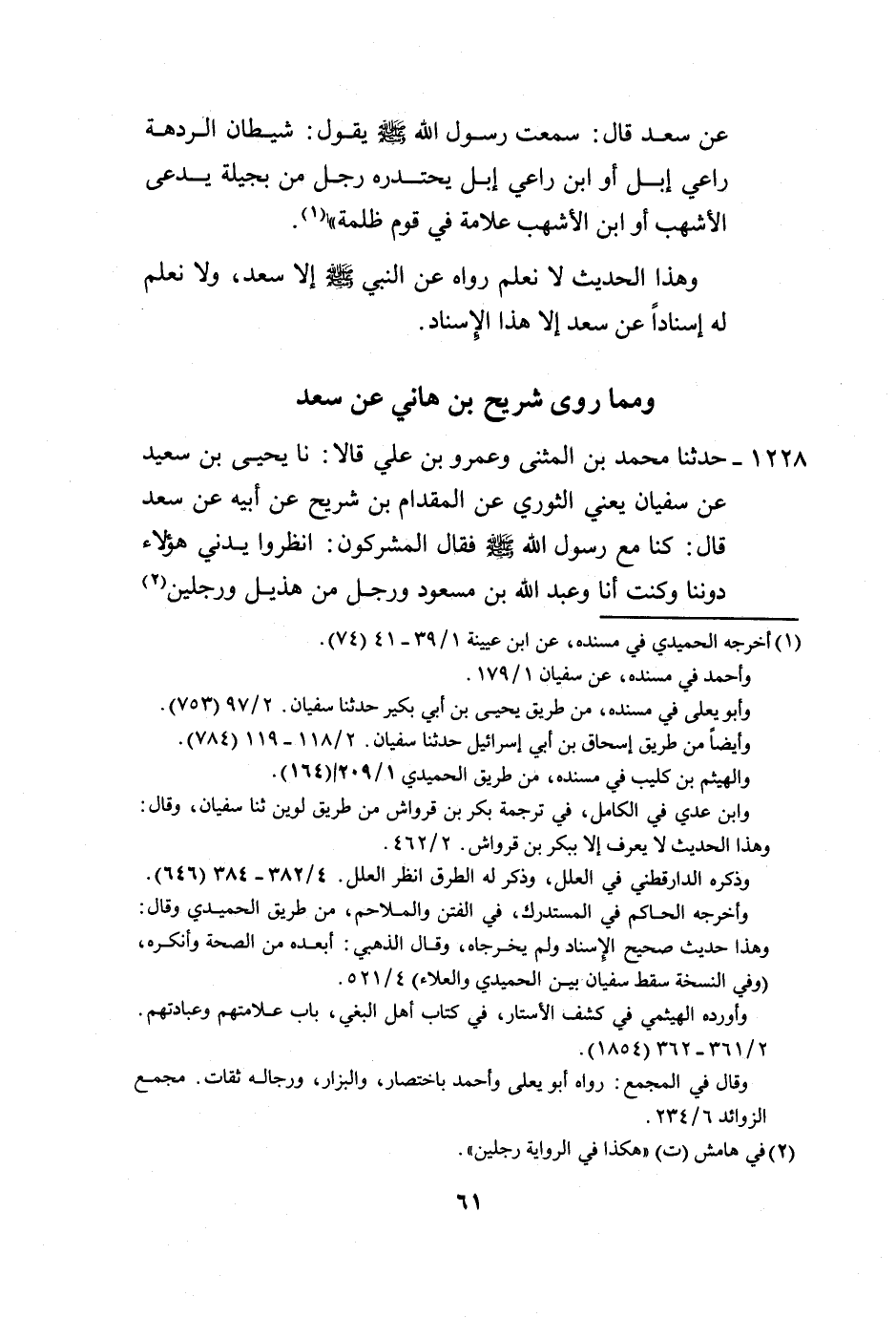 1228 - حَدَّثَنَا مُحَمَّدُ بْنُ الْمُثَنَّى، وَعَمْرُو بْنُ عَلِيٍّ، قَالَا: نَا يَحْيَى بْنُ سَعِيدٍ، عَنْ سُفْيَانَ يَعْنِي الثَّوْرِيَّ، عَنِ الْمِقْدَامِ بْنِ شُرَيْحٍ، عَنْ أَبِيهِ، عَنْ سَعْدٍ، قَالَ: كُنَا مَعَ رَسُولِ اللَّهِ صَلَّى اللهُ عَلَيْهِ وَسَلَّمَ، §فَقَالَ الْمُشْرِكُونَ: انْظُرُوا يُدْنِي هَؤُلَاءَ دُونَنَا، وَكُنْتُ أَنَا وَعَبْدُ اللَّهِ بْنُ مَسْعُودٍ، وَرَجُلٌ مِنْ هُذَيْلٍ وَرَجُلَيْنِ -[62]- نَسِيتُ أَسْماءَهُمَا، فَوَقَعَ فِي نَفْسِ رَسُولِ اللَّهِ صَلَّى اللهُ عَلَيْهِ وَسَلَّمَ، وَحَدَّثَ بِهِ نَفْسَهُ، فَأَنْزَلَ اللَّهُ تَبَارَكَ وَتَعَالَى: {وَلَا تَطْرُدِ الَّذِينَ يَدْعُونَ رَبَّهُمْ بِالْغَدَاةِ وَالْعَشِيِّ يُرِيدُونَ وَجْهَهُ} [الأنعام: 52] ، إِلَى: {وَكَذَلِكَ فَتَنَا بَعْضَهُمْ بِبَعْضٍ} [الأنعام: 53] وَهَذَا الْحَدِيثُ لَا نَعْلَمُهُ يُرْوَى عَنْ سَعْدٍ إِلَّا مِنْ هَذَا الْوَجْهِ بِهَذَا الْإِسْنَادِ
