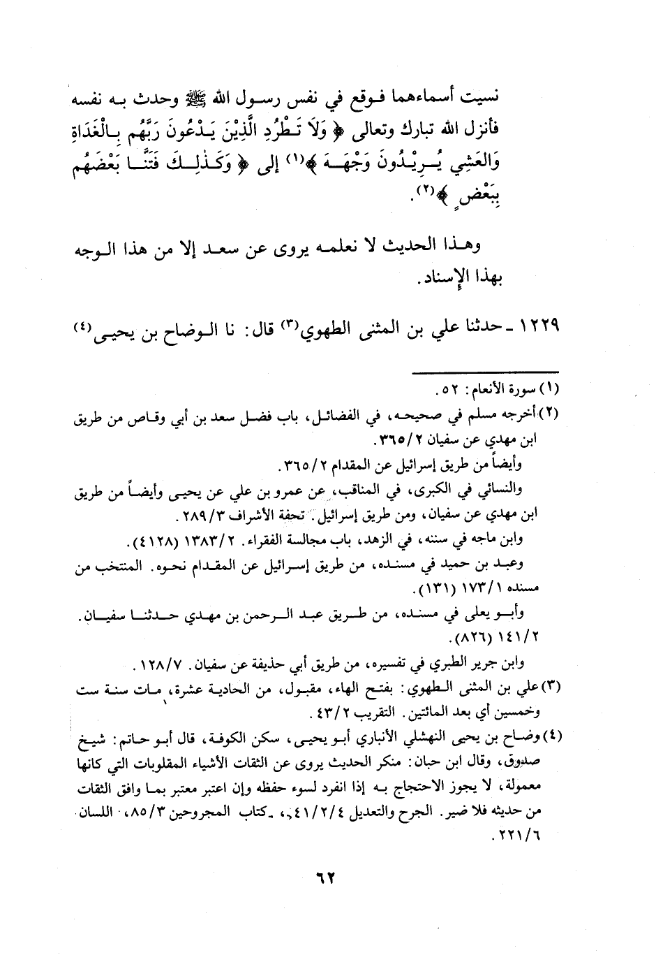 1229 - حَدَّثَنَا عَلِيُّ بْنُ الْمُثَنَّى الطُّهَوِيُّ، قَالَ: نَا الْوَضَّاحُ بْنُ يَحْيَى -[63]-، قَالَ: نَا قَيْسٌ، عَنِ الْمِقْدَامِ بْنِ شُرَيْحٍ، عَنْ أَبِيهِ، عَنْ سَعْدٍ، قَالَ: «كَانَ §النَّاسُ يَتَسَاءَلُونَ عَنِ الشَّيْءِ مِنْ أَمْرِ رَسُولِ اللَّهِ صَلَّى اللهُ عَلَيْهِ وَسَلَّمَ أَوْ يَسْأَلُونَ رَسُولَ اللَّهِ صَلَّى اللهُ عَلَيْهِ وَسَلَّمَ، وَهُو حَلَالٌ، فَلَا يَزَالُونَ يَسْأَلُونَ فِيهِ حَتَّى يَحْرُمَ عَلَيْهِمْ» وَهَذَا الْحَدِيثُ لَا نَعْلَمُهُ يُرْوَى مِنْ حَدِيثِ الْمِقْدَامِ بْنِ شُرَيْحٍ، عَنْ أَبِيهِ، إِلَّا مِنْ حَدِيثِ قَيْسٍ عَنْهُ