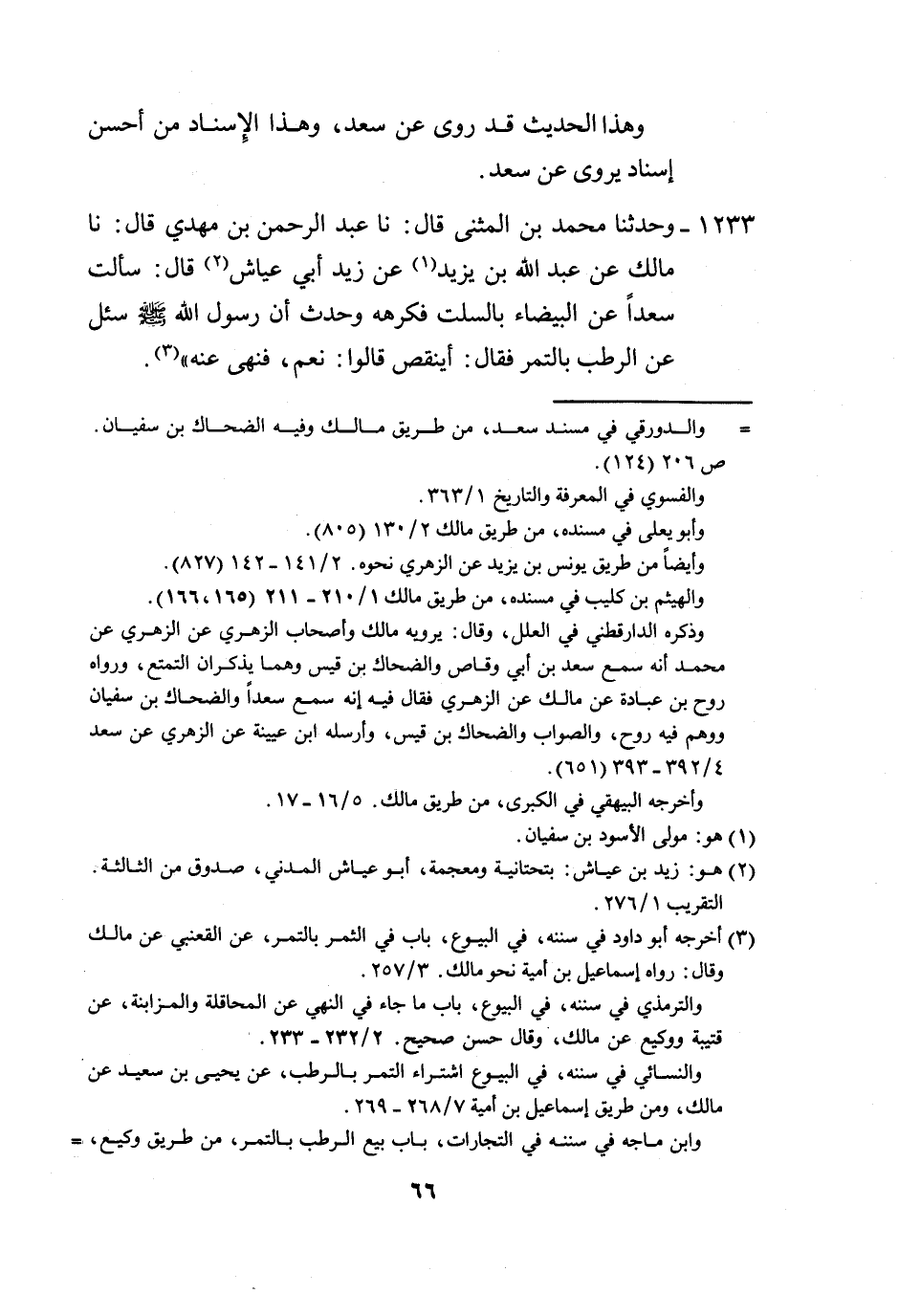 1233 - وَحَدَّثَنَا مُحَمَّدُ بْنُ الْمُثَنَّى، قَالَ: نَا عَبْدُ الرَّحْمَنِ بْنُ مَهْدِيٍّ، قَالَ: نَا مَالِكٌ، عَنْ عَبْدِ اللَّهِ بْنِ يَزِيدَ، عَنْ زَيْدٍ أَبِي عَيَّاشٍ، قَالَ: سَأَلْتُ سَعْدًا، عَنِ الْبَيْضَاءَ بِالسُّلْتِ، فَكَرِهَهُ، وَحَدَّثَ أَنَّ: §رَسُولَ اللَّهِ صَلَّى اللهُ عَلَيْهِ وَسَلَّمَ سُئِلَ عَنِ الرُّطَبِ بِالتَّمْرِ، فَقَالَ: «أَيَنْقُصُ؟» ، قَالُوا: نَعَمْ، فَنَهَى عَنْهُ -[68]- وَهَذَا الْحَدِيثُ لَا نَعْلَمُهُ يُرْوَى عَنْ سَعْدٍ، إِلَّا مِنْ هَذَا الْوَجْهِ بِهَذَا الْإِسْنَادِ