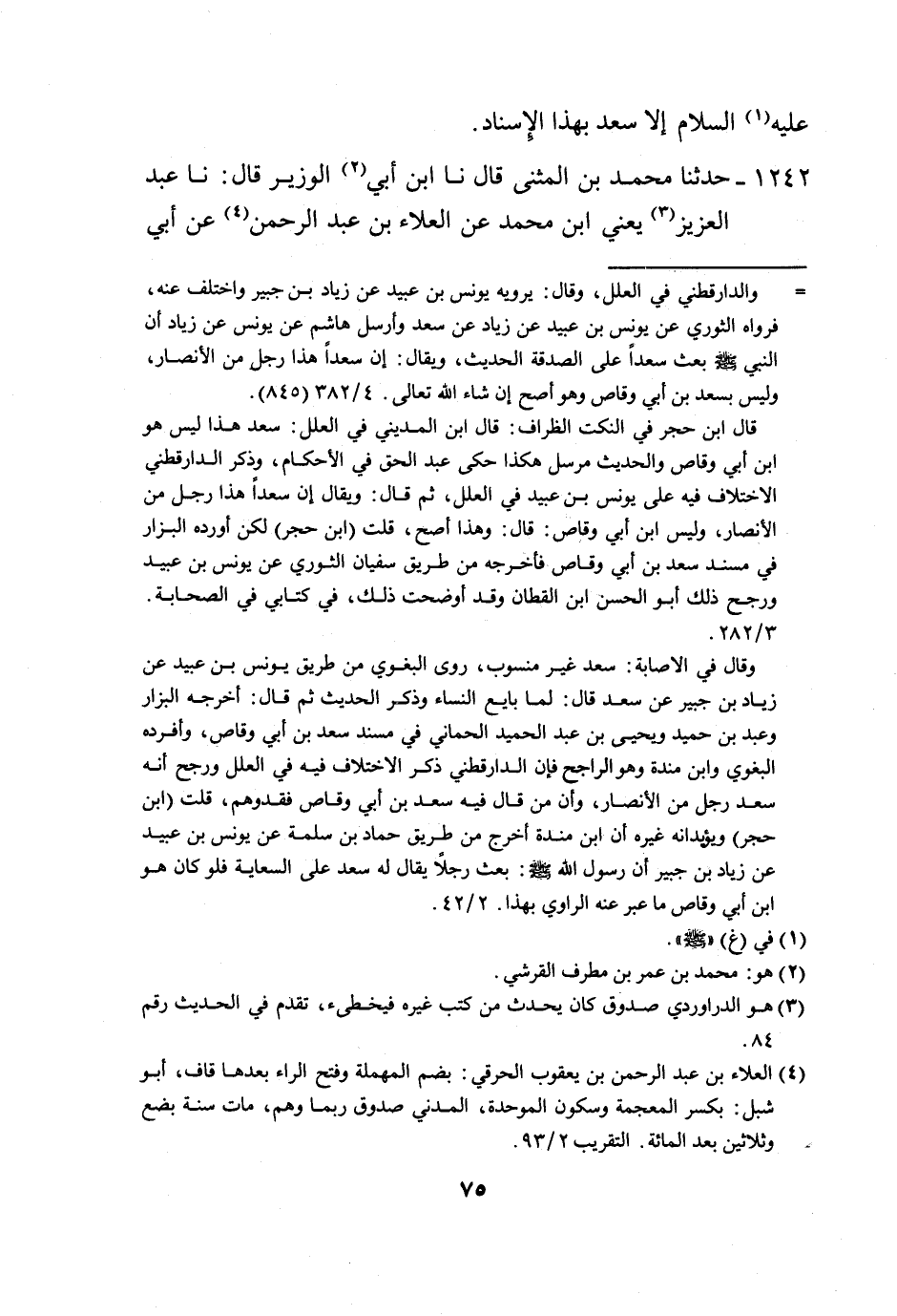 1242 - حَدَّثَنَا مُحَمَّدُ بْنُ الْمُثَنَّى، قَالَ: نَا ابْنُ أَبِي الْوَزِيرِ، قَالَ: نَا عَبْدُ الْعَزِيزِ يَعْنِي ابْنَ مُحَمَّدٍ، عَنِ الْعَلَاءِ بْنِ عَبْدِ الرَّحْمَنِ، عَنْ أَبِي -[76]- كَثِيرٍ، عَنْ سَعْدٍ، قَالَ: سَمِعْتُ رَسُولَ اللَّهِ صَلَّى اللهُ عَلَيْهِ وَسَلَّمَ، يَقُولُ: «§لَوْ أَنَّ رَجُلًا قُتِلَ فِي سَبِيلِ اللَّهِ ثُمَّ أَحْيِيَ، ثُمَّ قُتِلَ لَمْ يَدْخُلِ الْجَنَّةَ حَتَّى يُقْضَى دَيْنُهُ» وَهَذَا الْحَدِيثُ لَا نَعْلَمُهُ يُرْوَى عَنْ سَعْدٍ إِلَّا مِنْ هَذَا الْوَجْهِ، وَقَدْ رَوَاهُ بَعْضُ أَصْحَابِ عَبْدِ الْعَزِيزِ، عَنْ عَبْدِ الْعَزِيزِ، عَنِ الْعَلَاءِ بْنِ عَبْدِ الرَّحْمَنِ، عَنْ أَبِي كَثِيرٍ مَوْلَى عَبْدِ اللَّهِ بْنِ جَحْشٍ، عَنْ مُحَمَّدِ بْنِ عَبْدِ اللَّهِ بْنِ جَحْشٍ، عَنِ النَّبِيِّ عَلَيْهِ السَّلَامُ