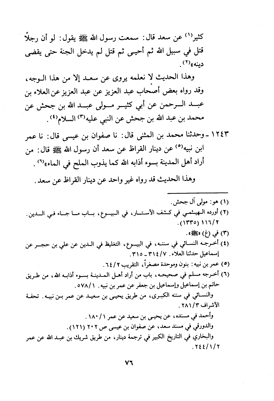 1243 - وَحَدَّثَنَا مُحَمَّدُ بْنُ الْمُثَنَّى، قَالَ: نَا صَفْوَانُ بْنُ عِيسَى، قَالَ: نَا عُمَرُ بْنُ نُبَيْهٍ، عَنْ دِينَارٍ الْقَرَّاظِ، عَنْ سَعْدٍ، أَنَّ رَسُولَ اللَّهِ صَلَّى اللهُ عَلَيْهِ وَسَلَّمَ، قَالَ: «§مَنْ أَرَادَ أَهْلَ الْمَدِينَةِ بِسُوءٍ أَذَابَهُ اللَّهُ، كَمَا يَذُوبُ الْمِلْحُ فِي الْمَاءِ» وَهَذَا الْحَدِيثُ قَدْ رَوَاهُ غَيْرُ وَاحِدٍ، عَنْ دِينَارٍ الْقَرَّاظِ، عَنْ سَعْدٍ