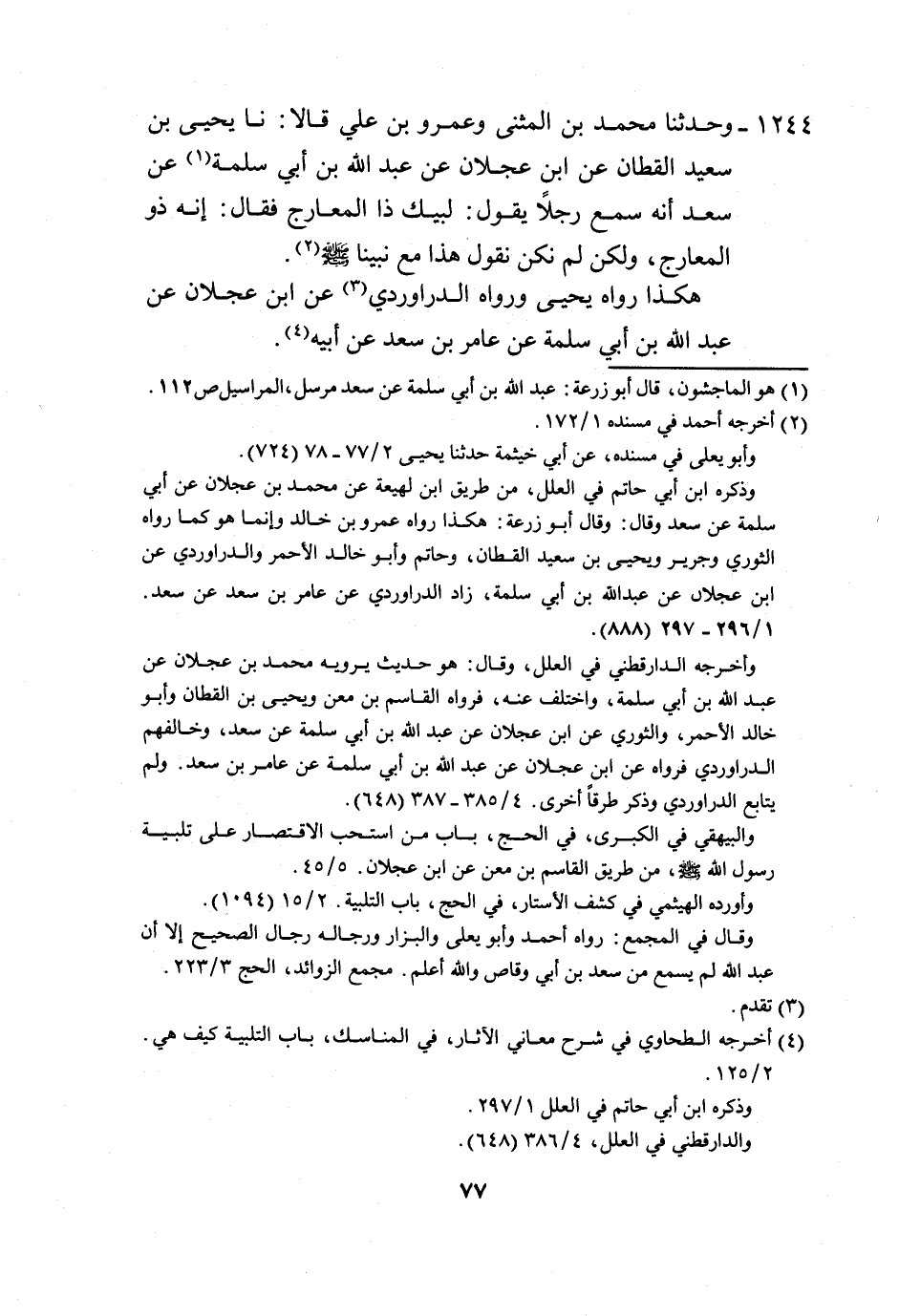 1244 - وَحَدَّثَنَا مُحَمَّدُ بْنُ الْمُثَنَّى، وَعَمْرُو بْنُ عَلِيٍّ، قَالَا: نَا يَحْيَى بْنُ سَعِيدٍ الْقَطَّانُ، عَنِ ابْنِ عَجْلَانَ، عَنْ عَبْدِ اللَّهِ بْنِ أَبِي سَلَمَةَ، عَنْ سَعْدٍ، أَنَّهُ §سَمِعَ رَجُلًا، يَقُولُ: لَبَّيْكَ ذَا الْمَعَارِجِ، فَقَالَ: «إِنَّهُ ذُو الْمَعَارِجِ، وَلَكِنْ لَمْ نَكُنْ نَقُولُ هَذَا مَعَ نَبِيِّنَا صَلَّى اللهُ عَلَيْهِ وَسَلَّمَ» هَكَذَا رَوَاهُ يَحْيَى، وَرَوَاهُ الدَّرَاوَرْدِيُّ، عَنِ ابْنِ عَجْلَانَ، عَنْ عَبْدِ اللَّهِ بْنِ أَبِي سَلَمَةَ، عَنْ عَامِرِ بْنِ سَعْدٍ، عَنْ أَبِيهِ -[78]-.