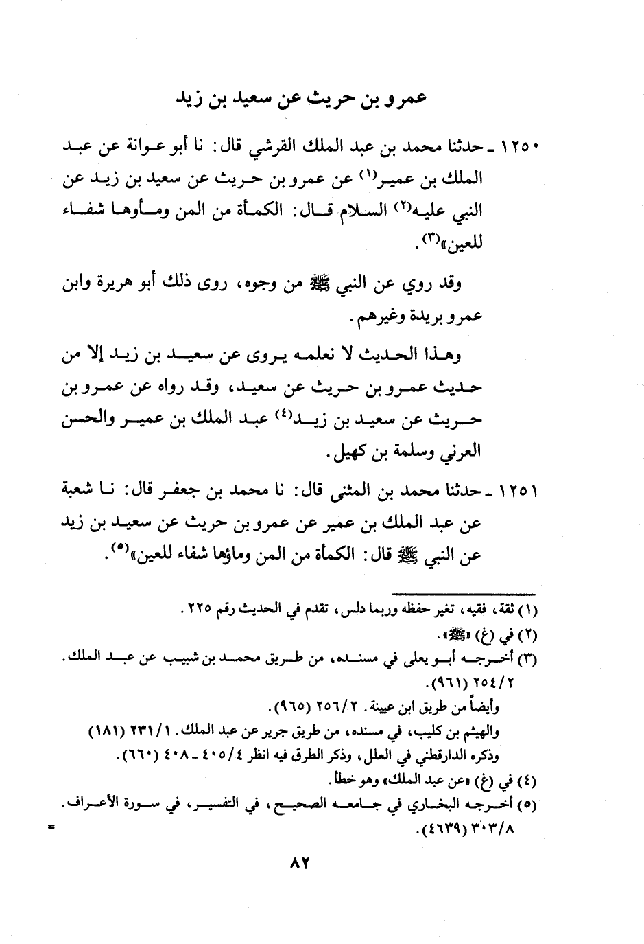 1250 - حَدَّثَنَا مُحَمَّدُ بْنُ عَبْدِ الْمَلِكِ الْقُرَشِيُّ، قَالَ: نَا أَبُو عَوَانَةَ، عَنْ عَبْدِ الْمَلِكِ بْنِ عُمَيْرٍ، عَنْ عَمْرِو بْنِ حُرَيْثٍ، عَنْ سَعِيدِ بْنِ زَيْدٍ، عَنِ النَّبِيِّ عَلَيْهِ السَّلَامُ، قَالَ: «§الْكَمْأَةُ مِنَ الْمَنِّ، وَمَاؤُهَا شِفَاءٌ لِلْعَيْنِ» وَقَدْ رُوِيَ عَنِ النَّبِيِّ صَلَّى اللَّهُ عَلَيْهِ وسلم، قَالَ: «الْكَمْأَةُ مِنَ الْمَنِّ، وَمَاؤُهَا شِفَاءٌ لِلْعَيْنِ» وَقَدْ رُوِيَ عَنِ النَّبِيِّ صَلَّى اللهُ عَلَيْهِ وَسَلَّمَ مِنْ وُجُوهٍ، رَوَى ذَلِكَ أَبُو هُرَيْرَةَ، وَابْنُ عُمَرَ، وَبُرَيْدَةُ، وَغَيْرُهُمْ وَهَذَا الْحَدِيثُ لَا نَعْلَمُهُ يُرْوَى عَنْ سَعِيدِ بْنِ زَيْدٍ إِلَّا مِنْ حَدِيثِ عَمْرِو بْنِ حُرَيْثٍ، عَنْ سَعِيدٍ، وَقَدْ رَوَاهُ عَنْ عَمْرِو بْنِ حُرَيْثٍ، عَنْ سَعِيدِ بْنِ زَيْدٍ عَبْدُ الْمَلِكِ بْنُ عُمَيْرٍ، وَالْحَسَنُ الْعُرَنِيُّ، وَسَلَمَةُ بْنُ كُهَيْلٍ