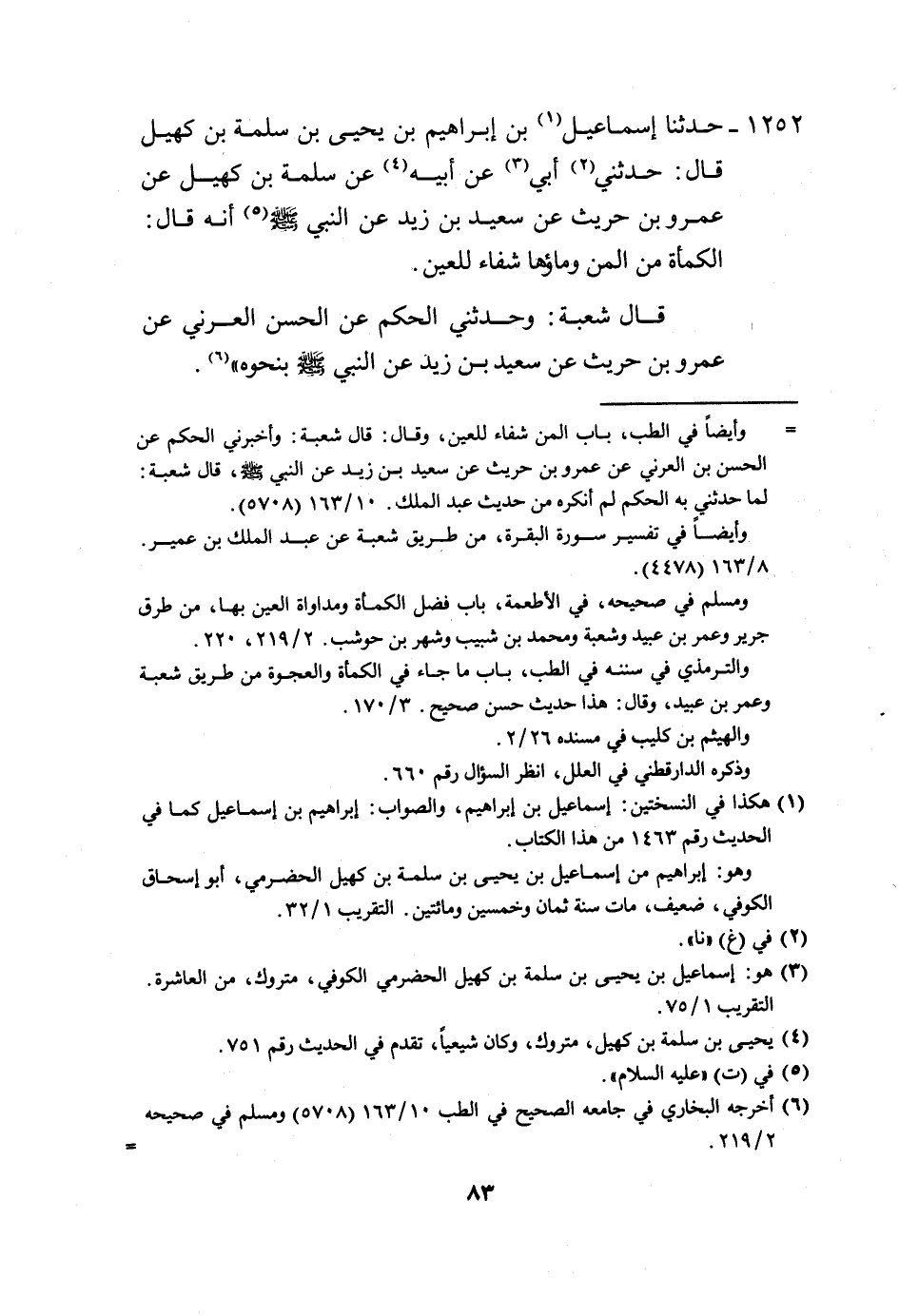 1252 - حَدَّثَنَا إِبْرَاهِيمُ بْنُ إِسْمَاعِيلَ بْنِ يَحْيَى بْنِ سَلَمَةَ بْنِ كُهَيْلٍ، قَالَ: حَدَّثَنِي أَبِي، عَنْ أَبِيهِ، عَنْ سَلَمَةَ بْنِ كُهَيْلٍ، عَنْ عَمْرِو بْنِ حُرَيْثٍ، عَنْ سَعِيدِ بْنِ زَيْدٍ، عَنِ النَّبِيِّ صَلَّى اللهُ عَلَيْهِ وَسَلَّمَ أَنَّهُ، قَالَ: «§الْكَمْأَةُ مِنَ الْمَنِّ، وَمَاؤُهَا شِفَاءٌ لِلْعَيْنِ» قَالَ شُعْبَةُ: وَحَدَّثَنِي الْحَكَمُ، عَنِ الْحَسَنِ الْعُرَنِيِّ، عَنْ عَمْرِو بْنِ حُرَيْثٍ، عَنْ سَعِيدِ بْنِ زَيْدٍ، عَنِ النَّبِيِّ صَلَّى اللهُ عَلَيْهِ وَسَلَّمَ بِنَحْوِهِ