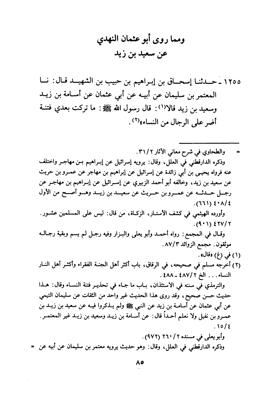 1255 - حَدَّثَنَا إِسْحَاقُ بْنُ إِبْرَاهِيمَ بْنِ حَبِيبِ بْنِ الشَّهِيدِ، قَالَ: نَا الْمُعْتَمِرُ بْنُ سُلَيْمَانَ، عَنْ أَبِيهِ، عَنْ أَبِي عُثْمَانَ، عَنْ أُسَامَةَ بْنِ زَيْدٍ، وَسَعِيدِ بْنِ زَيْدٍ، قَالَا: قَالَ رَسُولُ اللَّهِ صَلَّى اللهُ عَلَيْهِ وَسَلَّمَ: «§مَا تَرَكْتُ بَعْدِي فِتْنَةٌ أَضَرُّ عَلَى الرِّجَالِ مِنَ النِّسَاءِ» -[86]- وَهَذَا الْحَدِيثُ لَا نَعْلَمُهُ يُرْوَى، عَنْ سَعِيدِ بْنِ زَيْدٍ إِلَّا مِنْ هَذَا الْوَجْهِ، وَإِنَّمَا يُحْفَظُ هَذَا الْحَدِيثُ عَنْ أَبِي عُثْمَانَ، عَنْ أُسَامَةَ بْنِ زَيْدٍ، فَجَمَعَهُمَا الْمُعْتَمِرُ، عَنْ أَبِيهِ، عَنْ أَبِي عُثْمَانَ، عَنْ أُسَامَةَ وَسَعِيدِ بْنِ زَيْدٍ