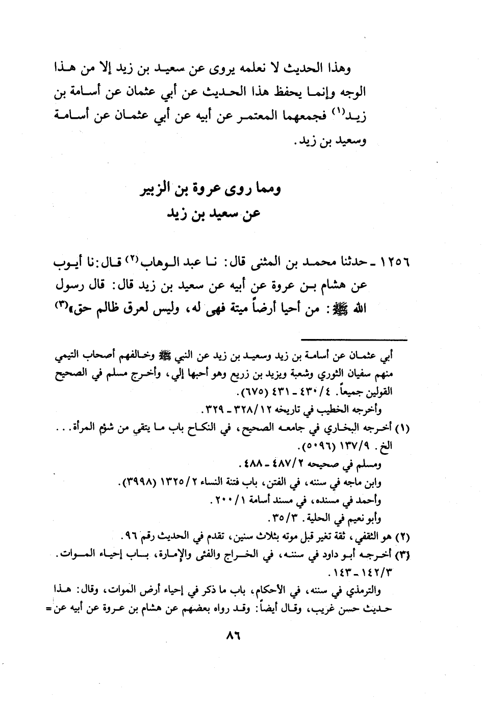 1256 - حَدَّثَنَا مُحَمَّدُ بْنُ الْمُثَنَّى، قَالَ: نَا عَبْدُ الْوَهَّابِ، قَالَ: نَا أَيُّوبُ، عَنْ هِشَامِ بْنِ عُرْوَةَ، عَنْ أَبِيهِ، عَنْ سَعِيدِ بْنِ زَيْدٍ، قَالَ: قَالَ رَسُولُ اللَّهِ صَلَّى اللهُ عَلَيْهِ وَسَلَّمَ: «§مَنْ أَحْيَا أَرْضًا مَيِّتَةً فَهِيَ لَهُ، وَلَيْسَ لِعِرْقٍ ظَالِمٍ حَقٌّ» -[87]- وَهَذَا الْحَدِيثُ قَدْ رَوَاهُ جَمَاعَةٌ، عَنْ هِشَامِ بْنِ عُرْوَةَ، عَنْ أَبِيهِ مُرْسَلًا، وَلَا نَحْفَظُ أَحَدًا، قَالَ: عَنْ هِشَامِ بْنِ عُرْوَةَ، عَنْ أَبِيهِ، عَنْ سَعِيدِ بْنِ زَيْدٍ إِلَّا عَبْدَ الْوَهَّابِ، عَنْ أَيُّوبَ