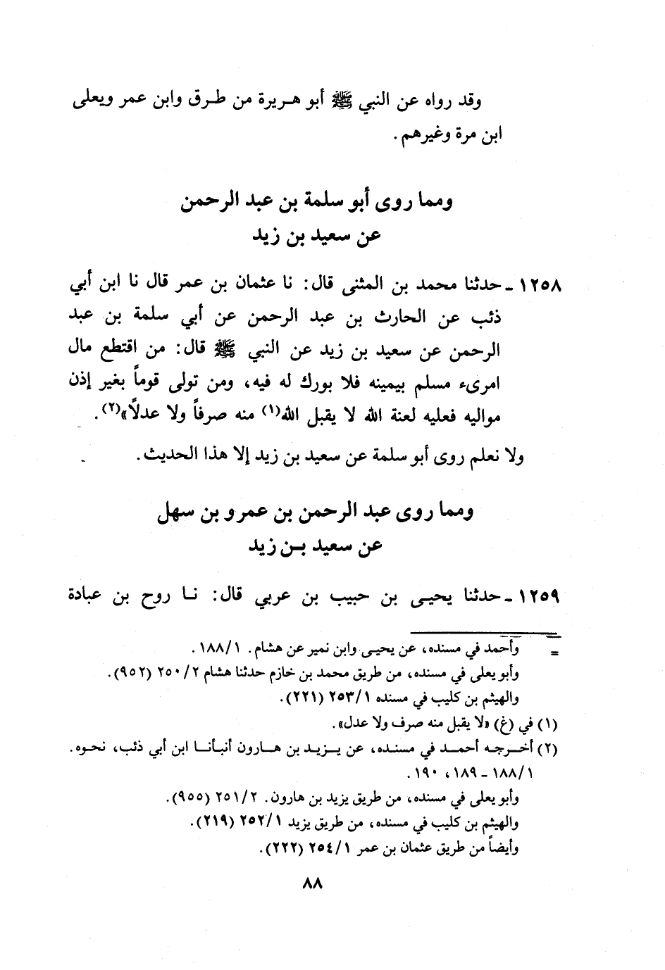 1258 - حَدَّثَنَا مُحَمَّدُ بْنُ الْمُثَنَّى، قَالَ: نَا عُثْمَانُ بْنُ عُمَرَ، قَالَ: نَا ابْنُ أَبِي ذِئْبٍ، عَنِ الْحَارِثِ بْنِ عَبْدِ الرَّحْمَنِ، عَنْ أَبِي سَلَمَةَ بْنِ عَبْدِ الرَّحْمَنِ، عَنْ سَعِيدِ بْنِ زَيْدٍ، عَنِ النَّبِيِّ صَلَّى اللهُ عَلَيْهِ وَسَلَّمَ، قَالَ: «§مَنَ اقْتَطَعَ مَالَ امْرِئٍ مُسْلِمٍ بِيَمِينِهِ، فَلَا بُورِكَ لَهُ فِيهِ، وَمَنْ تَوَلَّى قَوْمًا، بِغَيْرِ إِذَنِ مَوَالِيهِ، فَعَلَيْهِ لَعْنَةُ اللَّهِ، لَا يَقْبَلُ اللَّهُ مِنْهُ صَرْفًا، وَلَا عَدْلًا» وَلَا نَعْلَمُ رَوَى أَبُو سَلَمَةَ، عَنْ سَعِيدِ بْنِ زَيْدٍ إِلَّا هَذَا الْحَدِيثِ
