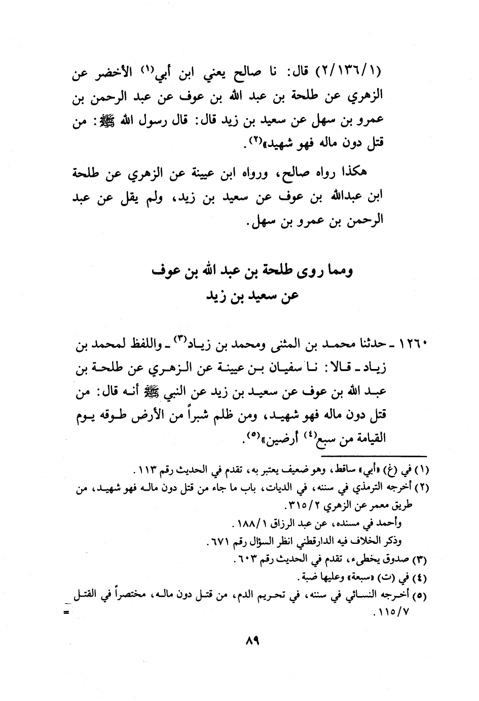1260 - حَدَّثَنَا مُحَمَّدُ بْنُ الْمُثَنَّى، وَمُحَمَّدُ بْنُ زِيَادٍ وَاللَّفْظُ لِمُحَمَّدِ بْنِ زِيَادٍ، قَالَا: نَا سُفْيَانُ بْنُ عُيَيْنَةَ، عَنِ الزُّهْرِيِّ، عَنْ طَلْحَةَ بْنِ عَبْدِ اللَّهِ بْنِ عَوْفٍ، عَنْ سَعِيدِ بْنِ زَيْدٍ، عَنِ النَّبِيِّ صَلَّى اللهُ عَلَيْهِ وَسَلَّمَ أَنَّهُ قَالَ: «§مَنْ قُتِلَ دُونَ مَالِهِ فَهُوَ شَهِيدٌ، وَمَنْ ظَلَمَ شِبْرًا مِنَ الْأَرْضِ طُوِّقَهُ يَوْمَ الْقِيَامَةِ مِنْ سَبْعِ أَرَضِينَ» -[90]- وَقَدْ رَوَى إِبْرَاهِيمُ بْنُ سَعْدٍ، عَنْ أَبِيهِ، عَنْ أَبِي عُبَيْدَةَ بْنِ مُحَمَّدِ بْنِ عَمَّارٍ، عَنْ طَلْحَةَ بْنِ عَبْدِ اللَّهِ بْنِ عَوْفٍ، عَنْ سَعِيدِ بْنِ زَيْدٍ، عَنِ النَّبِيِّ صَلَّى اللهُ عَلَيْهِ وَسَلَّمَ بِنَحْوِ: «مَنْ قُتِلَ دُونَ مَالِهِ فَهُوَ شَهِيدٌ»