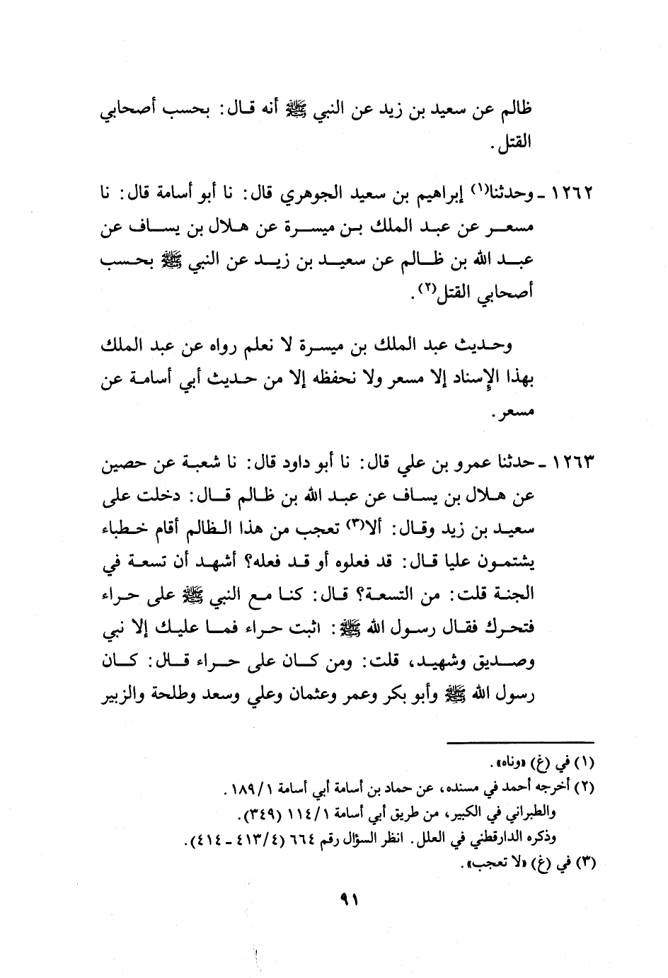 1263 - حَدَّثَنَا عَمْرُو بْنُ عَلِيٍّ، قَالَ: نَا أَبُو دَاوُدَ، قَالَ: نَا شُعْبَةُ، عَنْ حُصَيْنٍ، عَنْ هِلَالِ بْنِ يَسَافٍ، عَنْ عَبْدِ اللَّهِ بْنِ ظَالِمٍ، قَالَ: دَخَلْتُ عَلَى سَعِيدِ بْنِ زَيْدٍ، وَقَالَ: أَلَا تَعْجَبُ مِنْ هَذَا الظَّالِمِ؟، أَقَامَ خُطَبَاءَ يَشْتِمُونَ عَلِيًّا، قَالَ: قَدْ فَعَلُوهُ؟، أَوْ قَدْ فَعَلَهُ؟، أَشْهَدُ أَنَّ تِسْعَةً فِي الْجَنَّةِ، قُلْتُ مِنَ التِّسْعَةُ؟، قَالَ: كُنَا مَعَ النَّبِيِّ صَلَّى اللهُ عَلَيْهِ وَسَلَّمَ عَلَى حِرَاءَ، فَتَحَرَّكَ، فَقَالَ رَسُولُ اللَّهِ صَلَّى اللهُ عَلَيْهِ وَسَلَّمَ: «§اثْبُتْ حِرَاءُ، فَمَا عَلَيْكَ إِلَّا نَبِيُّ، وَصِدِّيقٌ، وَشَهِيدٌ» ، قُلْتُ: وَمَنْ كَانَ عَلَى حِرَاءَ؟، قَالَ: كَانَ رَسُولُ اللَّهِ صَلَّى اللهُ عَلَيْهِ وَسَلَّمَ، وَأَبُو بَكْرٍ، وَعُمَرُ، وَعُثْمَانُ، وَعَلِيٌّ، وَسَعْدٌ، وَطَلْحَةُ، وَالزُّبَيْرُ -[92]-، وَعَبْدُ الرَّحْمَنِ بْنُ عَوْفٍ، قُلْتُ: فَمَنِ الْعَاشِرُ؟، قَالَ: أَنَا وَهَذَا الْحَدِيثُ قَدْ رُوِيَ عَنْ سَعِيدِ بْنِ زَيْدٍ مِنْ غَيْرِ وَجْهٍ