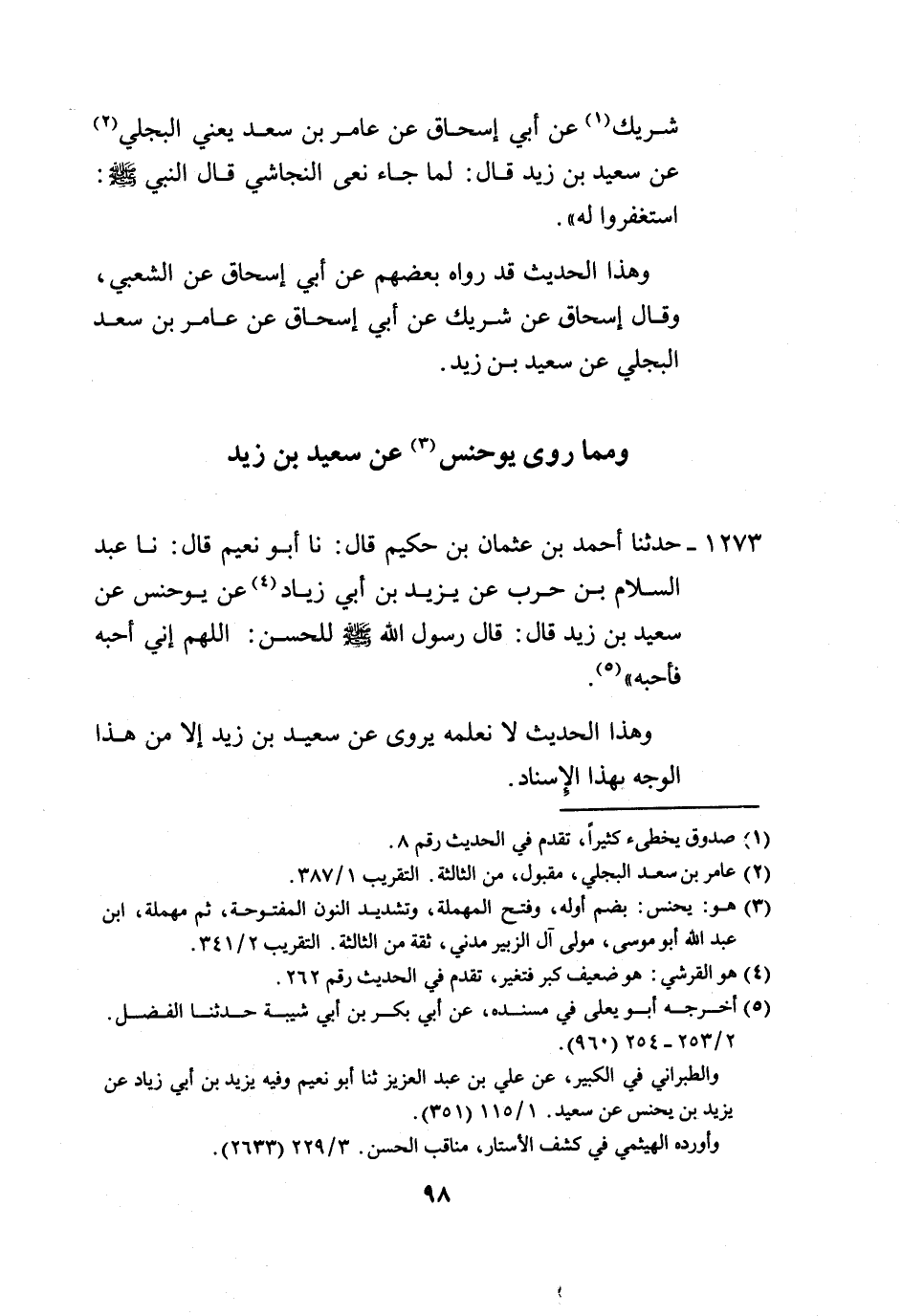 1273 - حَدَّثَنَا أَحْمَدُ بْنُ عُثْمَانَ بْنِ حَكِيمٍ، قَالَ: نَا أَبُو نُعَيْمٍ، قَالَ: نَا عَبْدُ السَّلَامِ بْنُ حَرْبٍ، عَنْ يَزِيدَ بْنِ أَبِي زِيَادٍ، عَنْ يُوحَنَّسِ، عَنْ سَعِيدِ بْنِ زَيْدٍ، قَالَ: §قَالَ رَسُولُ اللَّهِ صَلَّى اللهُ عَلَيْهِ وَسَلَّمَ لِلْحَسَنِ: «اللَّهُمَّ إِنِّي أُحِبُّهُ، فَأَحِبَّهُ» وَهَذَا الْحَدِيثُ لَا نَعْلَمُهُ يُرْوَى عَنْ سَعِيدِ بْنِ زَيْدٍ إِلَّا مِنْ هَذَا الْوَجْهِ بِهَذَا الْإِسْنَادِ