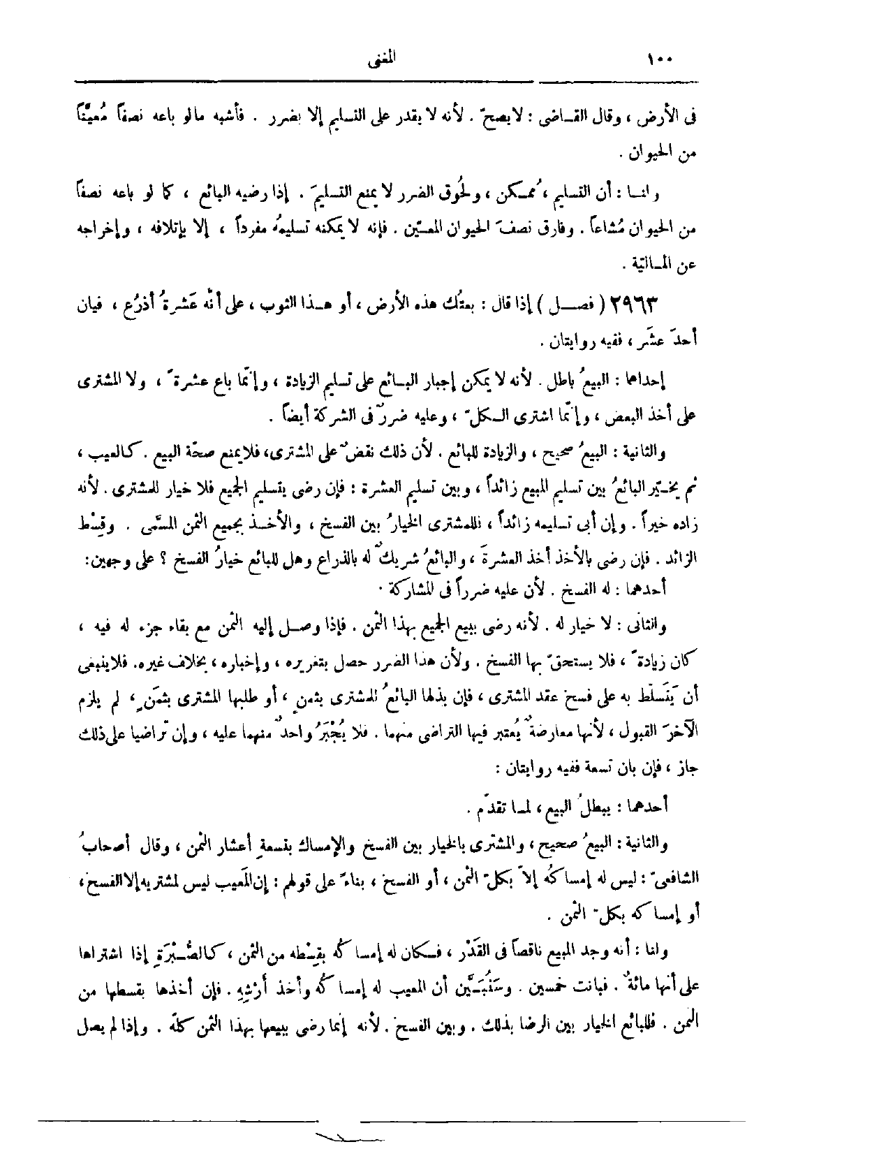 (٢٩٨٠) فَصْلٌ: إذَا قَالَ: بِعْتُك هَذِهِ الْأَرْضَ، أَوْ هَذَا الثَّوْبَ عَلَى أَنَّهُ عَشَرَةُ أَذْرُعٍ. فَبَانَ أَحَدَ عَشَرَ، فَفِيهِ رِوَايَتَانِ؛ إحْدَاهُمَا، الْبَيْعُ بَاطِلٌ؛ لِأَنَّهُ لَا يُمْكِنُ إجْبَارُ الْبَائِعِ عَلَى تَسْلِيمِ الزِّيَادَةِ، وَإِنَّمَا بَاعَ عَشَرَةً، وَلَا الْمُشْتَرِي عَلَى أَخْذِ الْبَعْضِ، وَإِنَّمَا اشْتَرَى الْكُلَّ، وَعَلَيْهِ ضَرَرٌ فِي الشَّرِكَةِ أَيْضًا. وَالثَّانِيَةُ، الْبَيْعُ صَحِيحٌ وَالزِّيَادَةُ لِلْبَائِعِ لِأَنَّ ذَلِكَ نَقْصٌ عَلَى الْمُشْتَرِي، فَلَا يَمْنَعُ صِحَّةَ الْبَيْعِ، كَالْعَيْبِ، ثُمَّ يُخَيَّرُ الْبَائِعُ بَيْنَ تَسْلِيمِ الْمَبِيعِ زَائِدًا وَبَيْنَ تَسْلِيمِ الْعَشَرَةِ، فَإِنْ رَضِيَ بِتَسْلِيمِ الْجَمِيعِ، فَلَا خِيَارَ لِلْمُشْتَرِي؛ لِأَنَّهُ زَادَهُ خَيْرًا، وَإِنْ أَبَى تَسْلِيمَهُ زَائِدًا، فَلِلْمُشْتَرِي الْخِيَارُ بَيْنَ الْفَسْخِ وَالْأَخْذِ بِجَمِيعِ الثَّمَنِ الْمُسَمَّى وَقِسْطِ الزَّائِدِ، فَإِنْ رَضِيَ بِالْأَخْذِ أَخَذَ الْعَشَرَةَ، وَالْبَائِعُ شَرِيكٌ لَهُ بِالذِّرَاعِ.