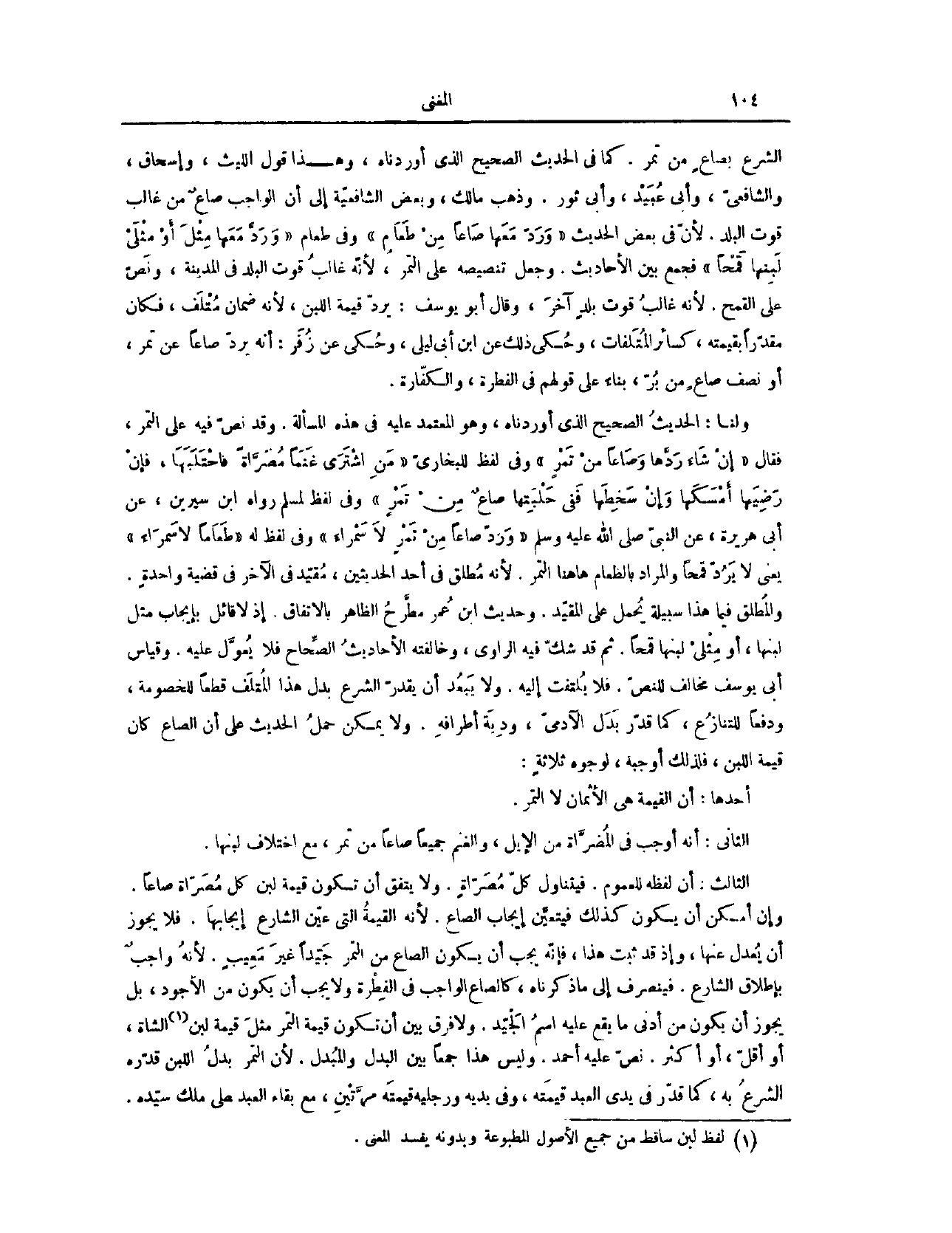 وَالْمُرَادُ بِالطَّعَامِ هَاهُنَا التَّمْرُ؛ لِأَنَّهُ مُطْلَقٌ فِي أَحَدِ الْحَدِيثَيْنِ، مُقَيَّدٌ فِي الْآخَرِ، فِي قَضِيَّةٍ وَاحِدَةٍ وَالْمُطْلَقُ فِيمَا هَذَا سَبِيلُهُ يُحْمَلُ عَلَى الْمُقَيَّدِ. وَحَدِيثُ ابْنِ عُمَرَ مَطْرَحُ الظَّاهِرِ بِالِاتِّفَاقِ؛ إذْ لَا قَائِلَ بِإِيجَابِ مِثْلِ لَبَنِهَا أَوْ مِثْلَيْ لَبَنِهَا قَمْحًا، ثُمَّ قَدْ شَكَّ فِيهِ الرَّاوِي، وَخَالَفَتْهُ الْأَحَادِيثُ الصِّحَاحُ، فَلَا يُعَوَّلُ عَلَيْهِ. وَقِيَاسُ أَبِي يُوسُفَ مُخَالِفٌ لِلنَّصِّ، فَلَا يُلْتَفَتُ إلَيْهِ وَلَا يَبْعُدُ أَنْ يُقَدِّرَ الشَّرْعُ، بَدَلَ هَذَا الْمُتْلَفِ، قَطْعًا لِلْخُصُومَةِ، وَدَفْعًا لِلتَّنَازُعِ، كَمَا قَدَّرَ بَدَلَ الْآدَمِيِّ وَدِيَةَ أَطْرَافِهِ، وَلَا يُمْكِنُ حَمْلُ الْحَدِيثِ عَلَى أَنَّ الصَّاعَ كَانَ قِيمَةَ اللَّبَنِ، فَلِذَلِكَ أَوْجَبَهُ، لِوُجُوهٍ ثَلَاثَةٍ: أَحَدُهَا، أَنَّ الْقِيمَةَ هِيَ الْأَثْمَانُ لَا التَّمْرُ. الثَّانِي، أَنَّهُ أَوْجَبَ فِي الْمُصَرَّاةِ مِنْ الْإِبِلِ وَالْغَنَمِ جَمِيعًا صَاعًا مِنْ تَمْرٍ، مَعَ اخْتِلَافِ لَبَنِهَا.