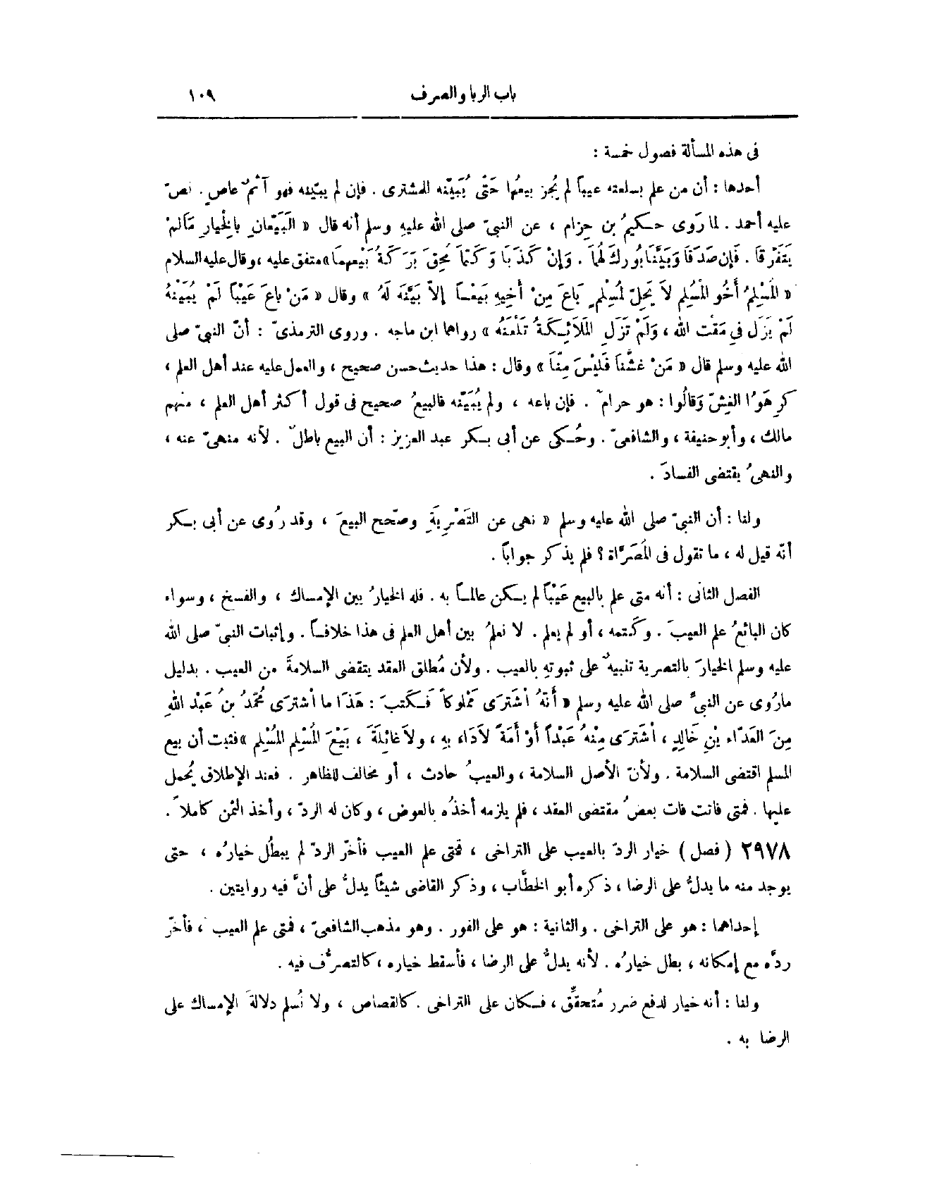فِي هَذِهِ الْمَسْأَلَةِ فُصُولٌ خَمْسَةٌ: (٢٩٩٨) الْفَصْلُ الْأَوَّلُ، أَنَّ مَنْ عَلِمَ بِسِلْعَتِهِ عَيْبًا، لَمْ يَجُزْ بَيْعُهَا، حَتَّى يُبَيِّنَهُ لِلْمُشْتَرِي. فَإِنْ لَمْ يُبَيِّنْهُ فَهُوَ آثِمٌ عَاصٍ. نَصَّ عَلَيْهِ أَحْمَدُ؛ لِمَا رَوَى حَكِيمُ بْنُ حِزَامٍ، عَنْ النَّبِيِّ - صَلَّى اللَّهُ عَلَيْهِ وَسَلَّمَ - أَنَّهُ قَالَ: «الْبَيِّعَانِ بِالْخِيَارِ مَا لَمْ يَتَفَرَّقَا، فَإِنْ صَدَقَا وَبَيَّنَا بُورِكَ لَهُمَا، وَإِنْ كَذِبَا وَكَتَمَا مُحِقَ بَرَكَةُ بَيْعِهِمَا» مُتَّفَقٌ عَلَيْهِ.