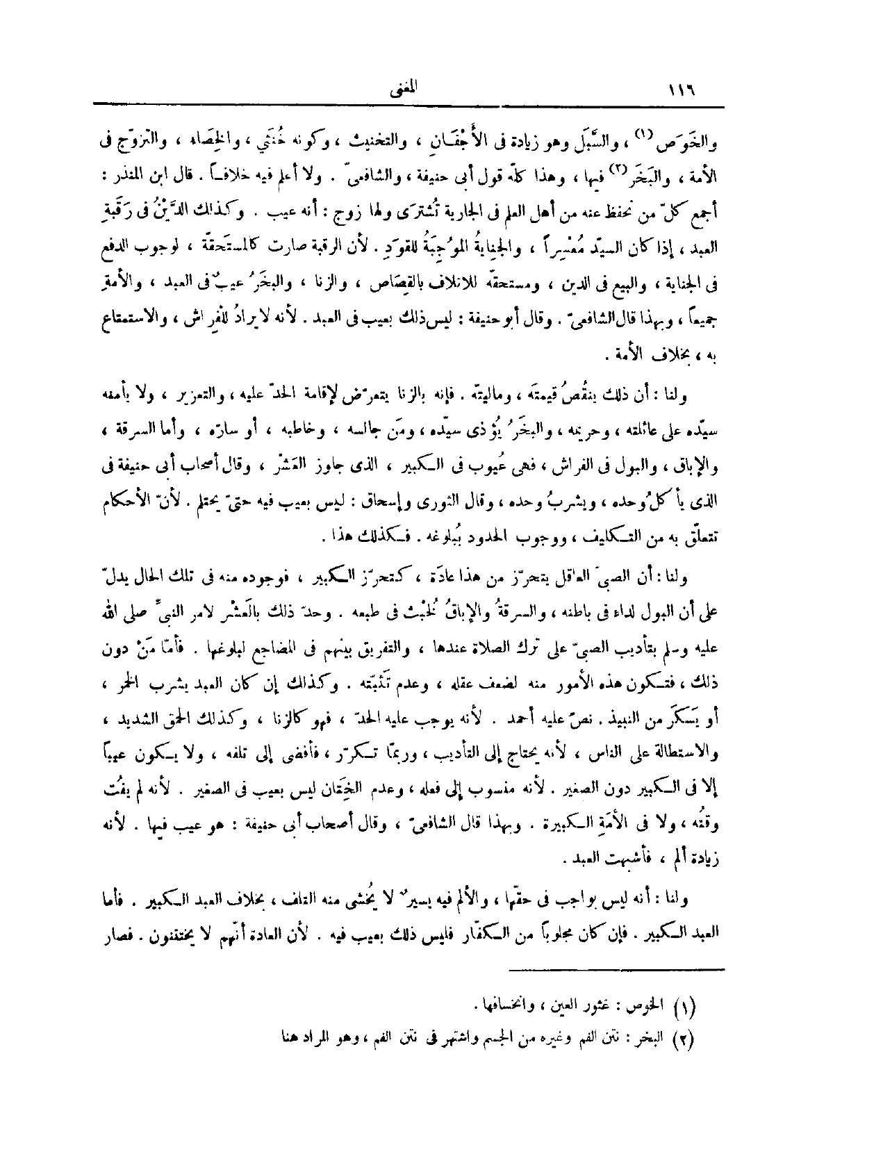 وَلَنَا، أَنَّ ذَلِكَ يُنْقِصُ قِيمَتَهُ وَمَالِيَّتَهُ، فَإِنَّهُ بِالزِّنَى يَتَعَرَّضُ لِإِقَامَةِ الْحَدِّ عَلَيْهِ وَالتَّعْزِيرِ، وَلَا يَأْمَنُهُ سَيِّدُهُ عَلَى عَائِلَتِهِ وَحَرِيمِهِ، وَالْبَخَرُ يُؤْذِي سَيِّدَهُ، وَمَنْ جَالَسَهُ وَخَاطَبَهُ أَوْ سَارَّهُ. وَأَمَّا السَّرِقَةُ، وَالْإِبَاقُ، وَالْبَوْلُ فِي الْفِرَاشِ، فَهِيَ عُيُوبٌ فِي الْكَبِيرِ الَّذِي جَاوَزَ الْعَشْرَ. وَقَالَ أَصْحَابُ أَبِي حَنِيفَةَ: فِي الَّذِي يَأْكُلُ وَحْدَهُ وَيَشْرَبُ وَحْدَهُ.