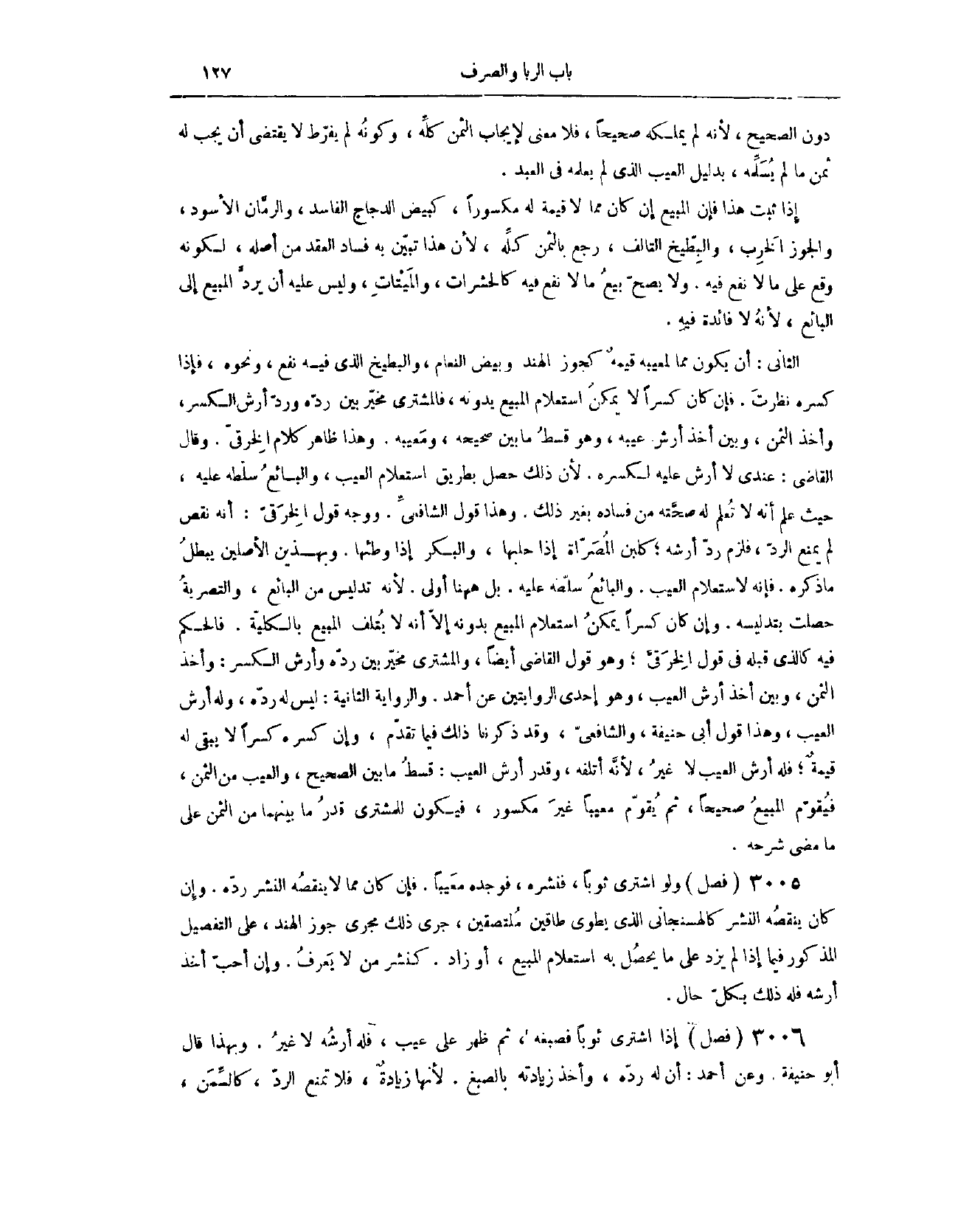 (٣٠٣٣) فَصْلٌ: وَلَوْ اشْتَرَى ثَوْبًا فَنَشَرَهُ فَوَجَدَهُ مَعِيبًا، فَإِنْ كَانَ مِمَّا لَا يَنْقُصُهُ النَّشْرُ، رَدَّهُ، وَإِنْ كَانَ يَنْقُصُهُ النَّشْرُ، كالهسنجاني، الَّذِي يُطْوَى طَاقَيْنِ مُلْتَصِقَيْنِ، جَرَى ذَلِكَ مَجْرَى جَوْزِ الْهِنْدِ، عَلَى التَّفْصِيلِ الْمَذْكُورِ، فِيمَا إذَا لَمْ يَزِدْ عَلَى مَا يَحْصُلُ بِهِ اسْتِعْلَامُ الْمَبِيعِ، أَوْ زَادَ، كَنَشْرِ مَنْ لَا يَعْرِفُ. وَإِنْ أَحَبَّ أَخْذَ أَرْشِهِ، فَلَهُ ذَلِكَ بِكُلِّ حَالٍ.