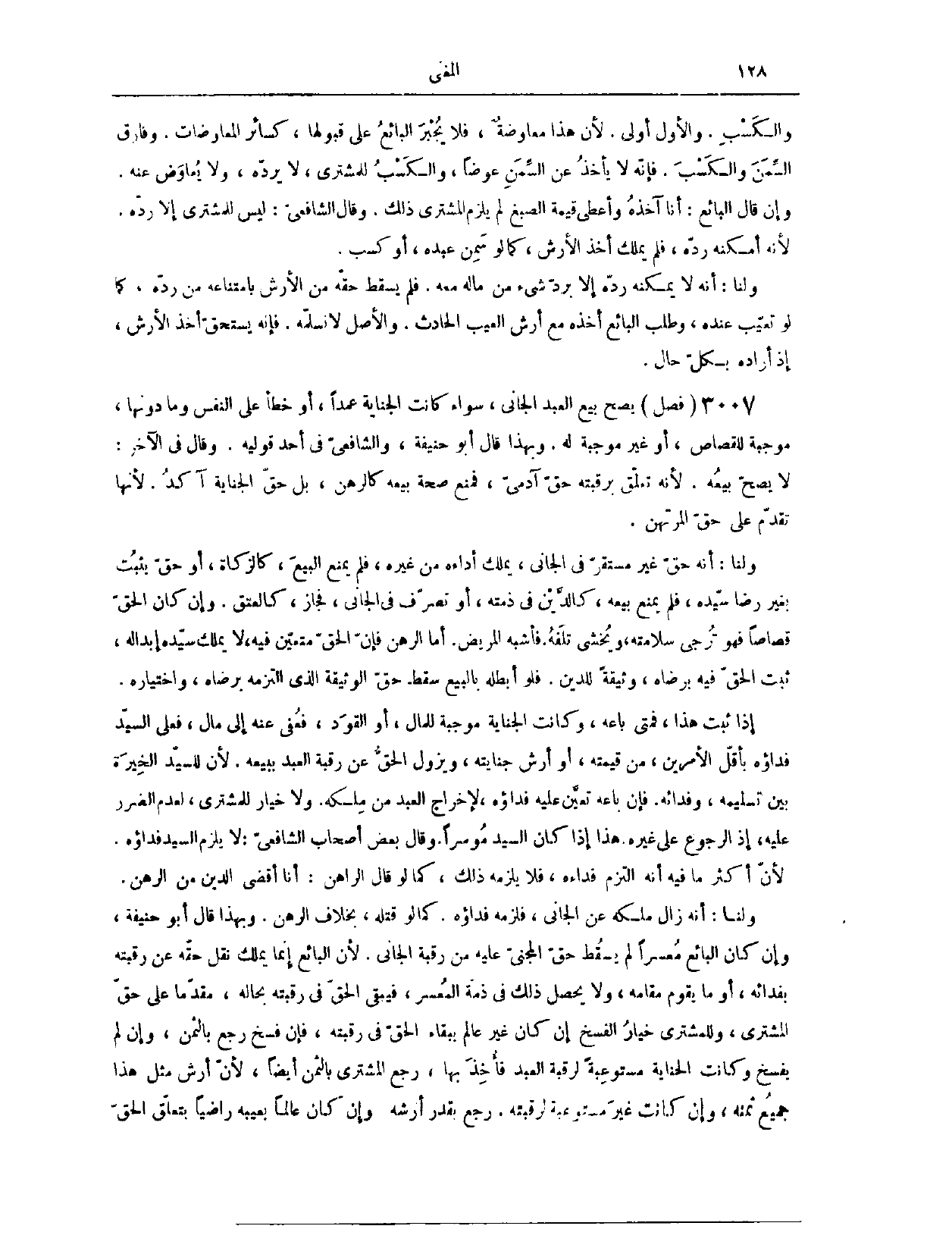 (٣٠٣٥) فَصْلٌ: يَصِحُّ بَيْعُ الْعَبْدِ الْجَانِي، سَوَاءٌ كَانَتْ الْجِنَايَةُ، عَمْدًا أَوْ خَطَأً، عَلَى النَّفْسِ وَمَا دُونَهَا، مُوجِبَةً لِلْقِصَاصِ أَوْ غَيْرَ مُوجِبَةٍ لَهُ. وَبِهَذَا قَالَ أَبُو حَنِيفَةَ، وَالشَّافِعِيُّ فِي أَحَدِ قَوْلَيْهِ، وَقَالَ فِي الْآخَرِ: لَا يَصِحُّ بَيْعُهُ؛ لِأَنَّهُ تَعَلَّقَ بِرَقَبَتِهِ حَقُّ آدَمِيٍّ، فَمَنَعَ صِحَّةَ بَيْعِهِ، كَالرَّهْنِ، بَلْ حَقُّ الْجِنَايَةِ آكَدُ؛ لِأَنَّهَا تُقَدَّمُ عَلَى حَقِّ الْمُرْتَهِنِ. وَلَنَا، أَنَّهُ حَقٌّ غَيْرُ مُسْتَقِرٍّ فِي الْجَانِي، يَمْلِكُ أَدَاءَهُ مِنْ غَيْرِهِ، فَلَمْ يَمْنَعْ الْبَيْعَ، كَالزَّكَاةِ، أَوْ حَقٌّ يَثْبُتُ بِغَيْرِ رِضَا سَيِّدِهِ، فَلَمْ يَمْنَعْ بَيْعَهُ، كَالدَّيْنِ فِي ذِمَّتِهِ، أَوْ تَصَرُّفٌ فِي الْجَانِي، فَجَازَ، كَالْعِتْقِ. وَإِنْ كَانَ الْحَقُّ قِصَاصًا، فَهُوَ تُرْجَى سَلَامَتُهُ وَيُخْشَى تَلَفُهُ، فَأَشْبَهَ الْمَرِيضَ.